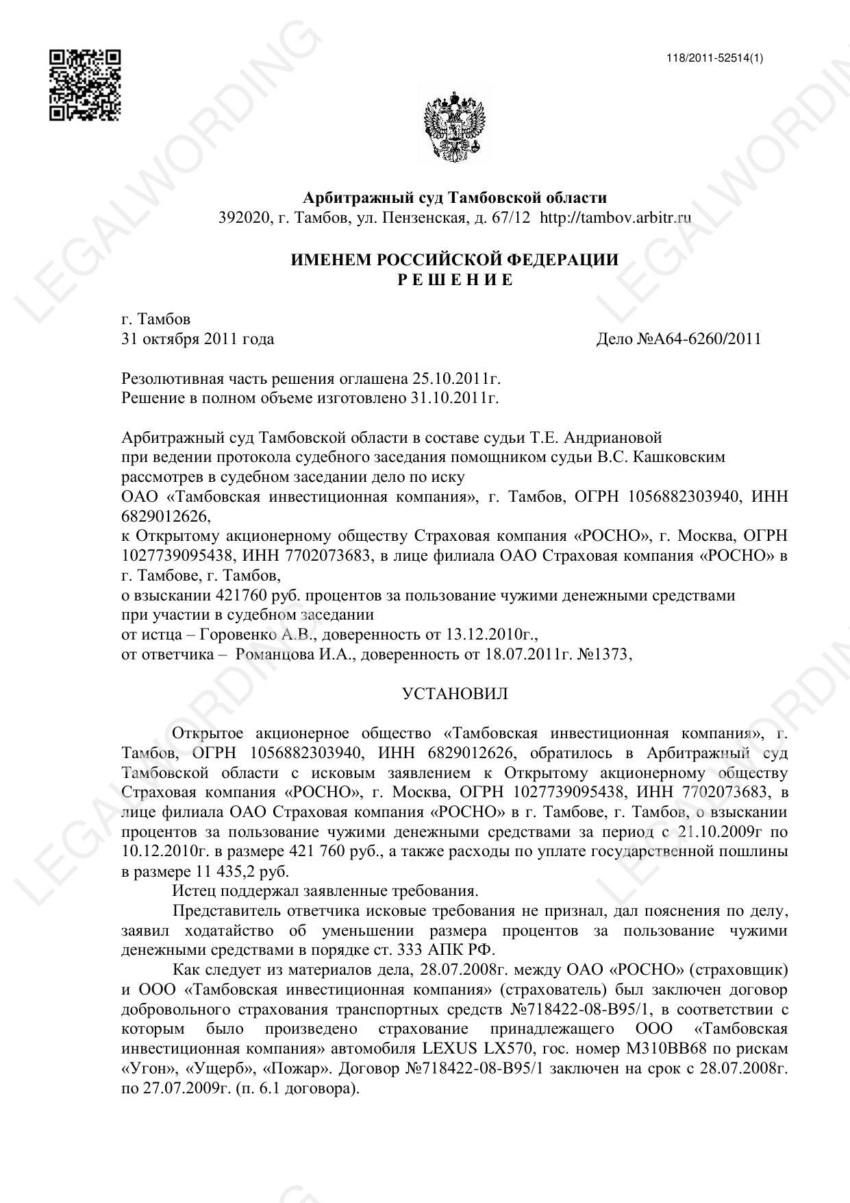 Главная/Документы/a claim for recovery of interest from ROSNO under Article 395 of the Civil Code of the Russian Federation for violation of the insurance indemnity payment period for the theft of LEXUS LX 570