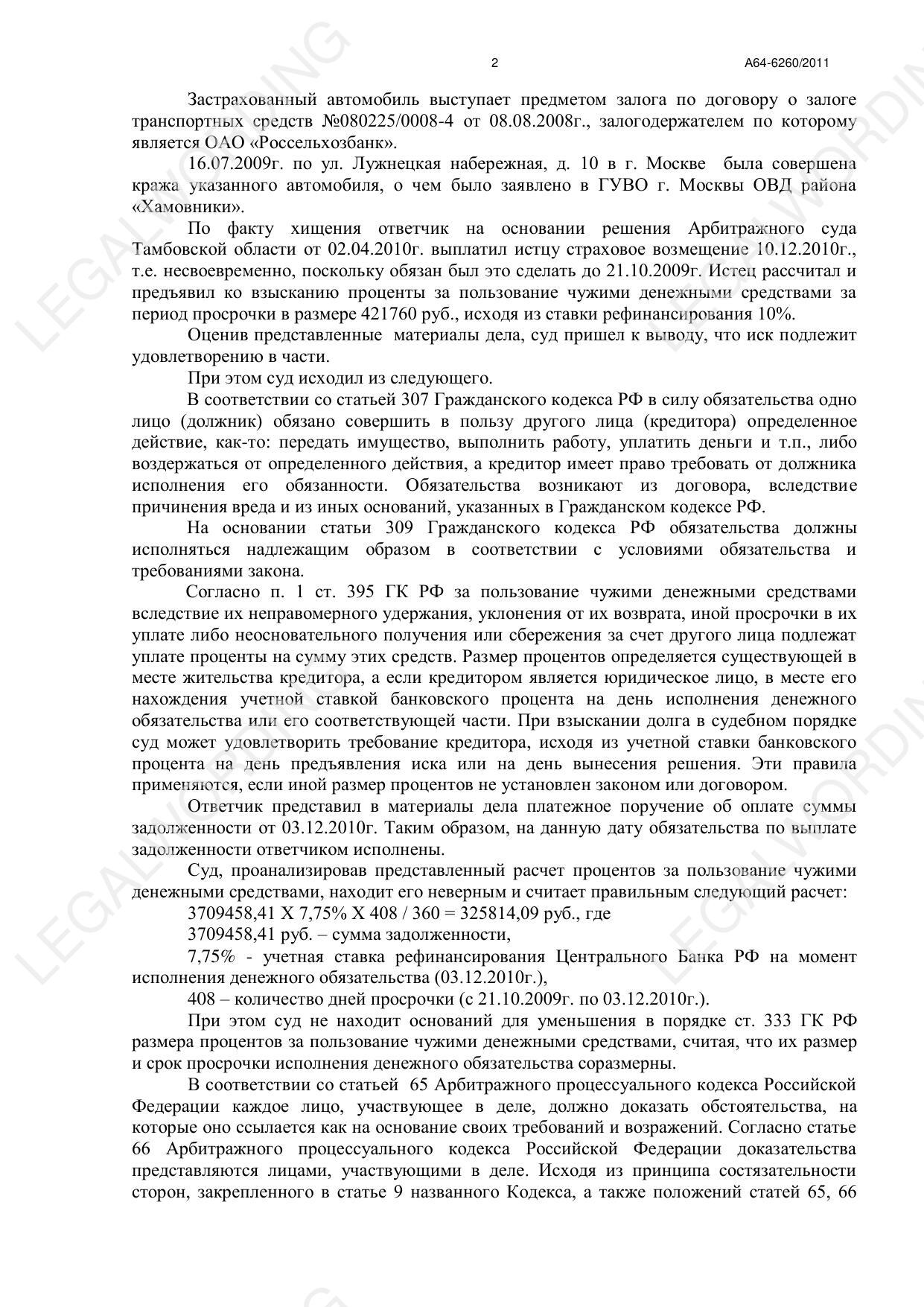 ROSNO insurance company violated the deadline for payment of insurance compensation for the theft of Lexus. The sum of the insurance indemnity of 3709,458.41 rubles was recovered in court. After that, interest was collected under art. 395 of the Civil Code of the Russian Federation.