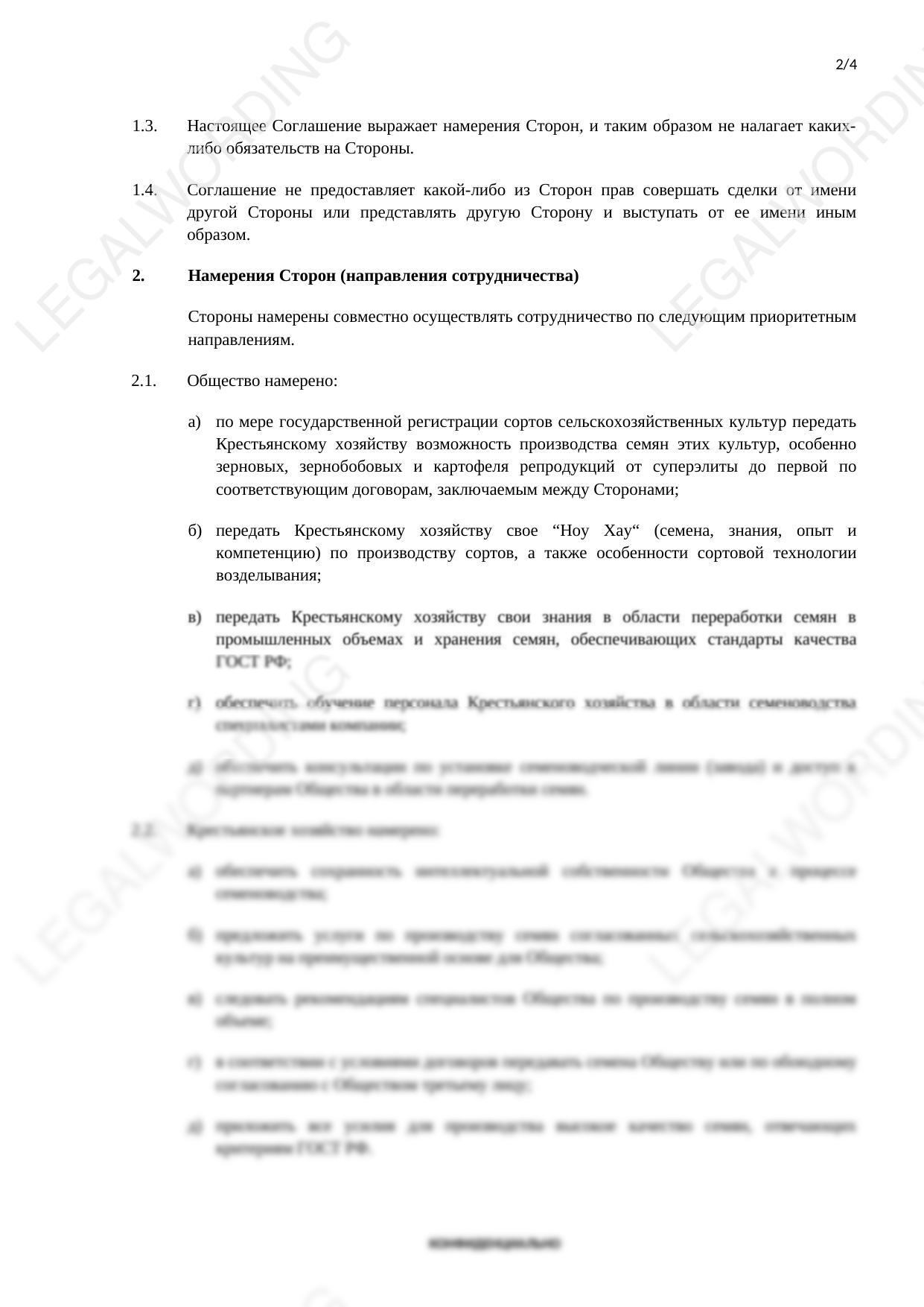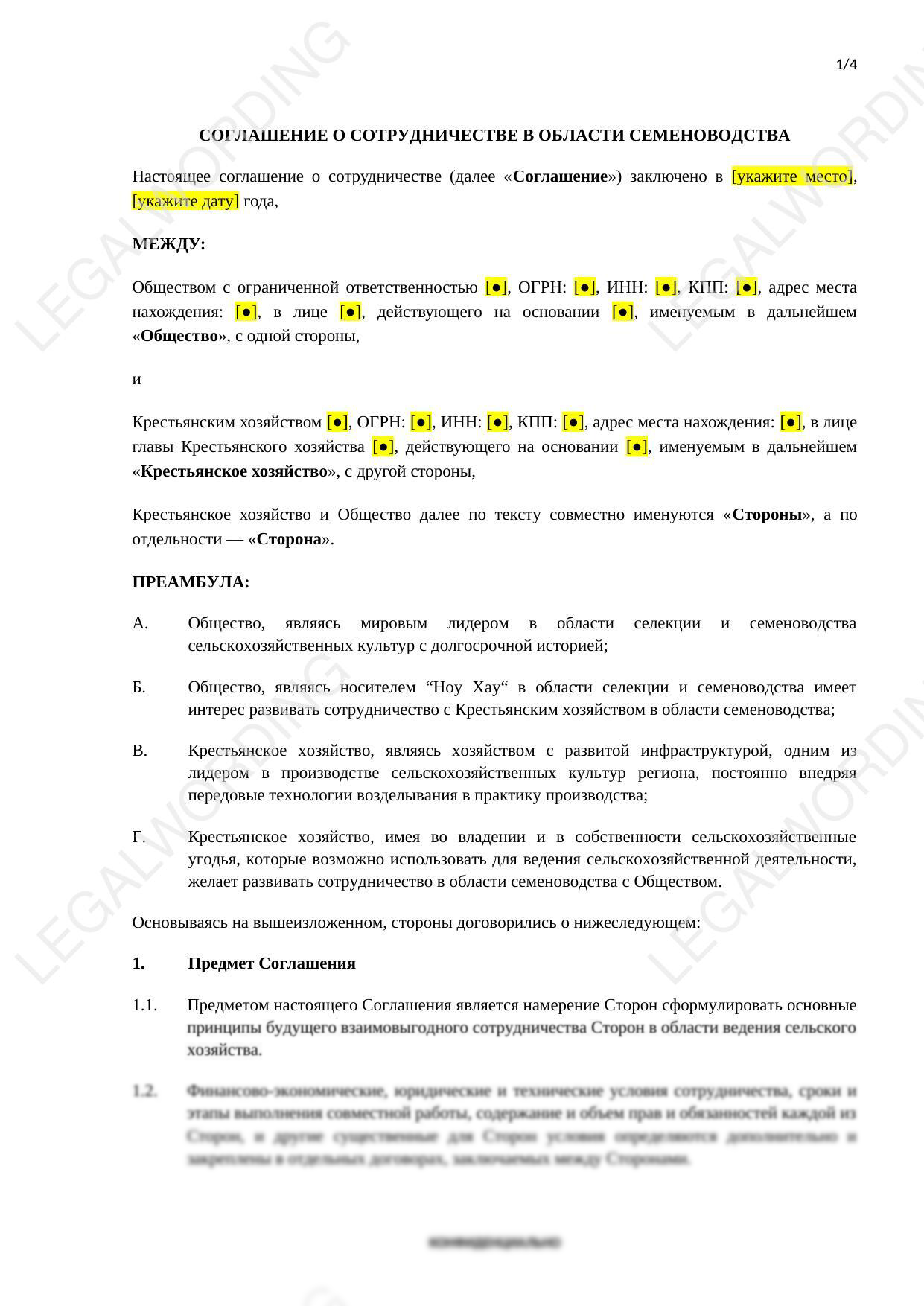 Agreement on cooperation in the field of agriculture between the leader in plant breeding and seed production – a holder of know-how in this field, and a peasant farm - the owner of agricultural land with developed infrastructure.