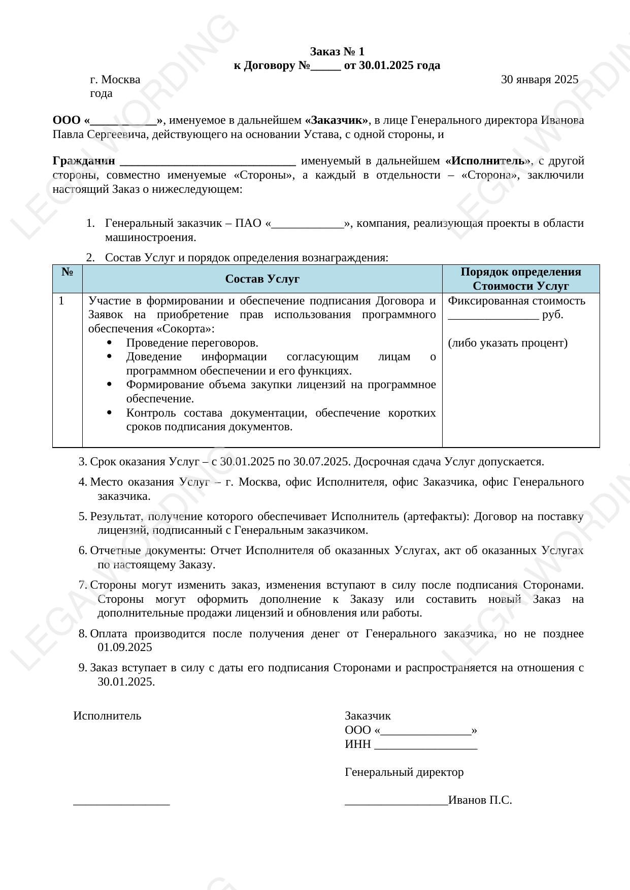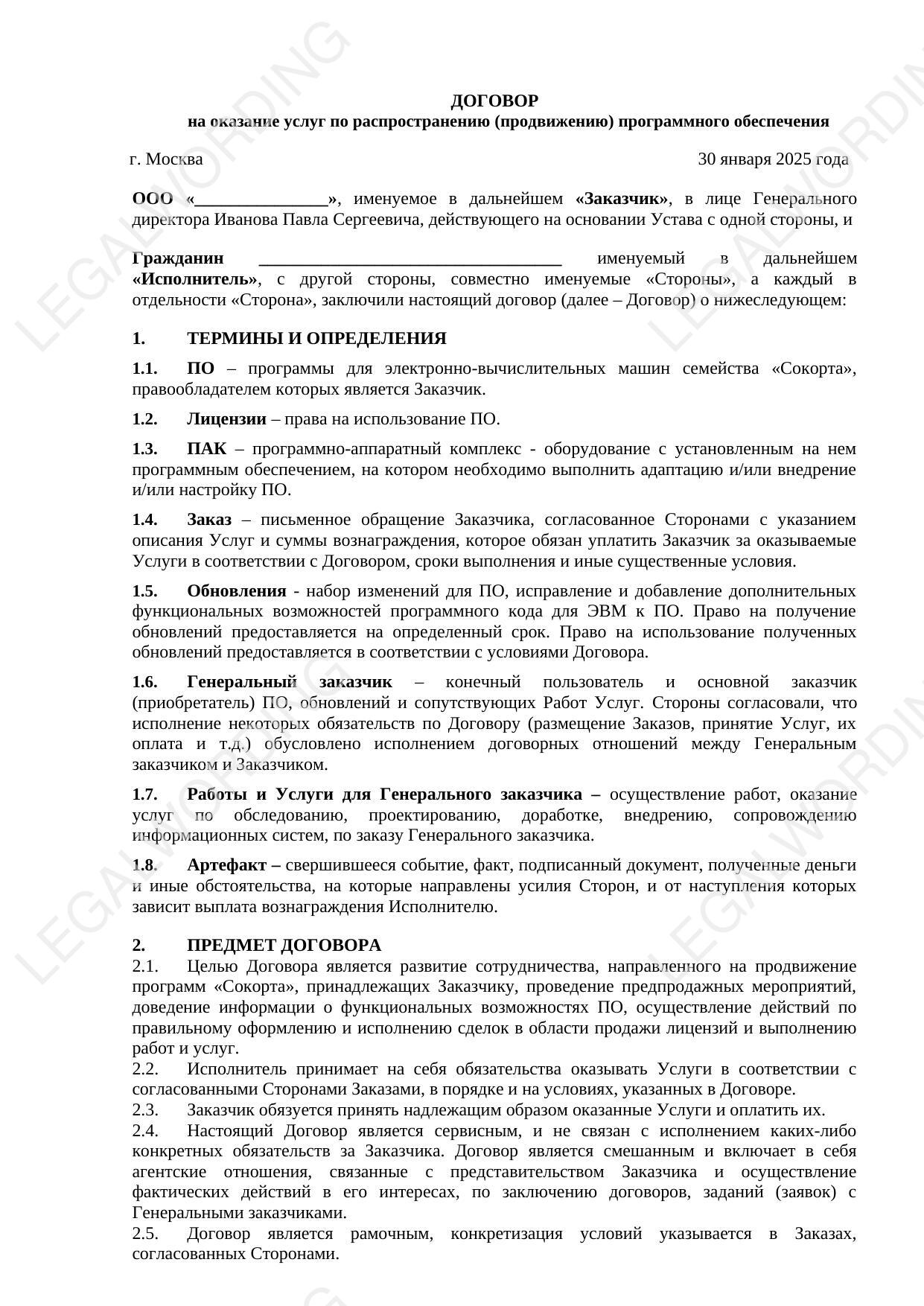 An agreement to involve an individual in the distribution of software. The agreement has the character of an agency agreement and a service agreement. The meaning of the contract is that the contractor is looking for clients, ensures the conclusion of the contract, and receives remuneration based on the achieved result. Receives a percentage of the sale or a fixed amount. The contract has an order form. A report form is attached to the agreement.