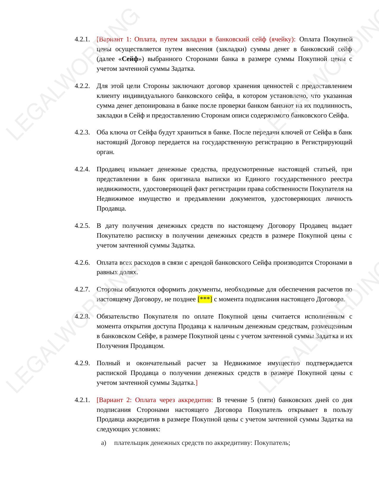 - Contract of sale of the apartment The main document of the transaction with detailed conditions provides for the choice of settlement method: using a safe deposit box when paying in cash, through a letter of credit or through an escrow account.