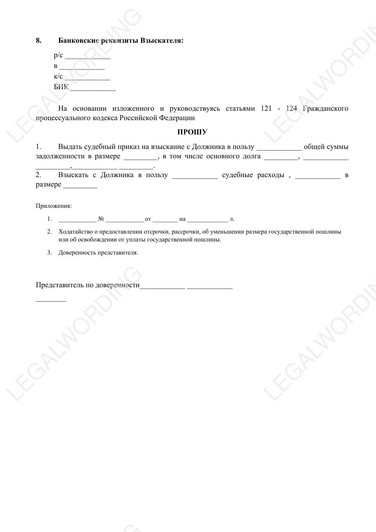 The template of the application for the issuance of a court order allows you to present the case in a structured and complete manner before the court, which helps to speed up the debt collection process and reduce administrative costs