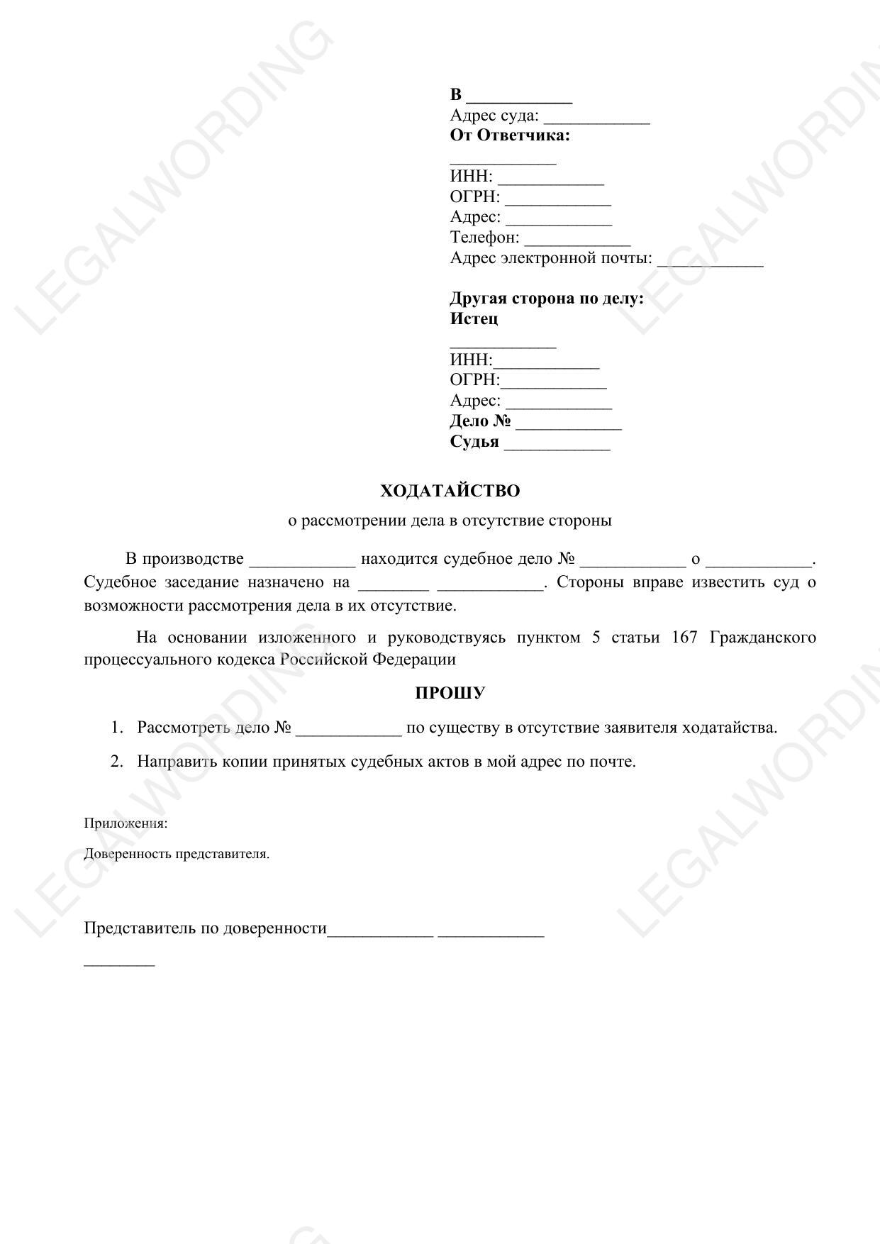 A template for a petition for consideration of a case in the absence of a party, intended for filing with a court by a legal entity. This template helps a legal entity to simplistically declare the case without his participation and includes the following key sections:
