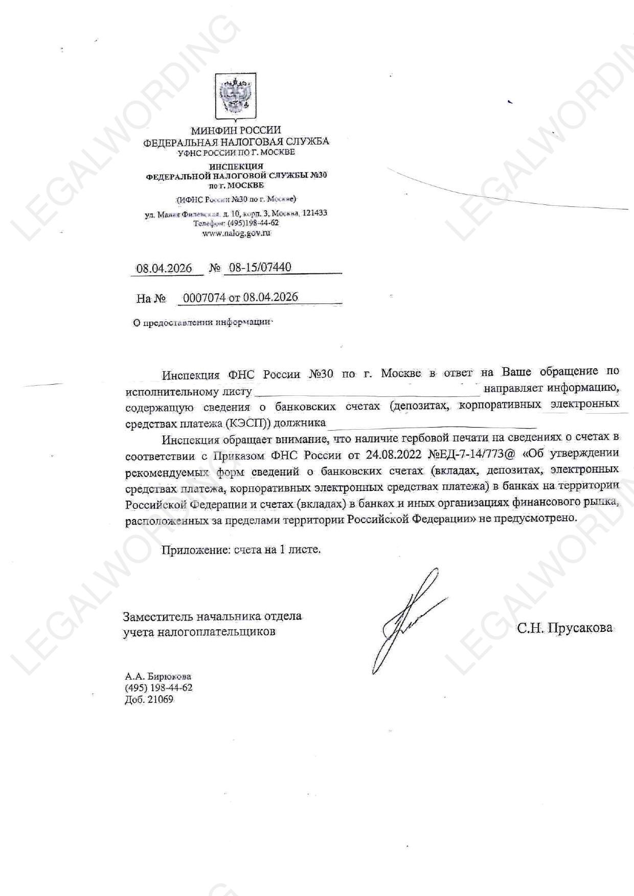 You can apply to any tax office for information about the debtor's current accounts. IFNS No. 30 in Moscow is characterized by the absence of queues and quick preparation of the response. The answer can be received within 5 days, in my case it was the next day after submitting the documents. The original of the writ of execution is required when submitting documents and upon receipt.Sberbank accepts applications with writ of execution at any branch, the main thing is not to forget the original power of attorney and passport.