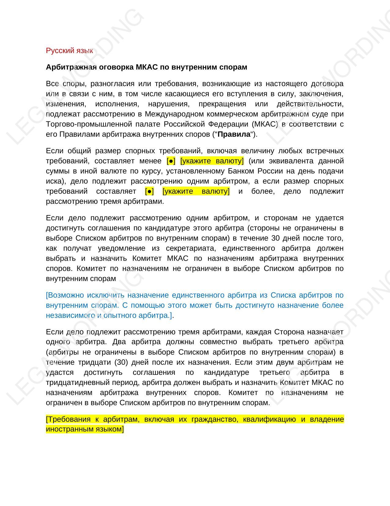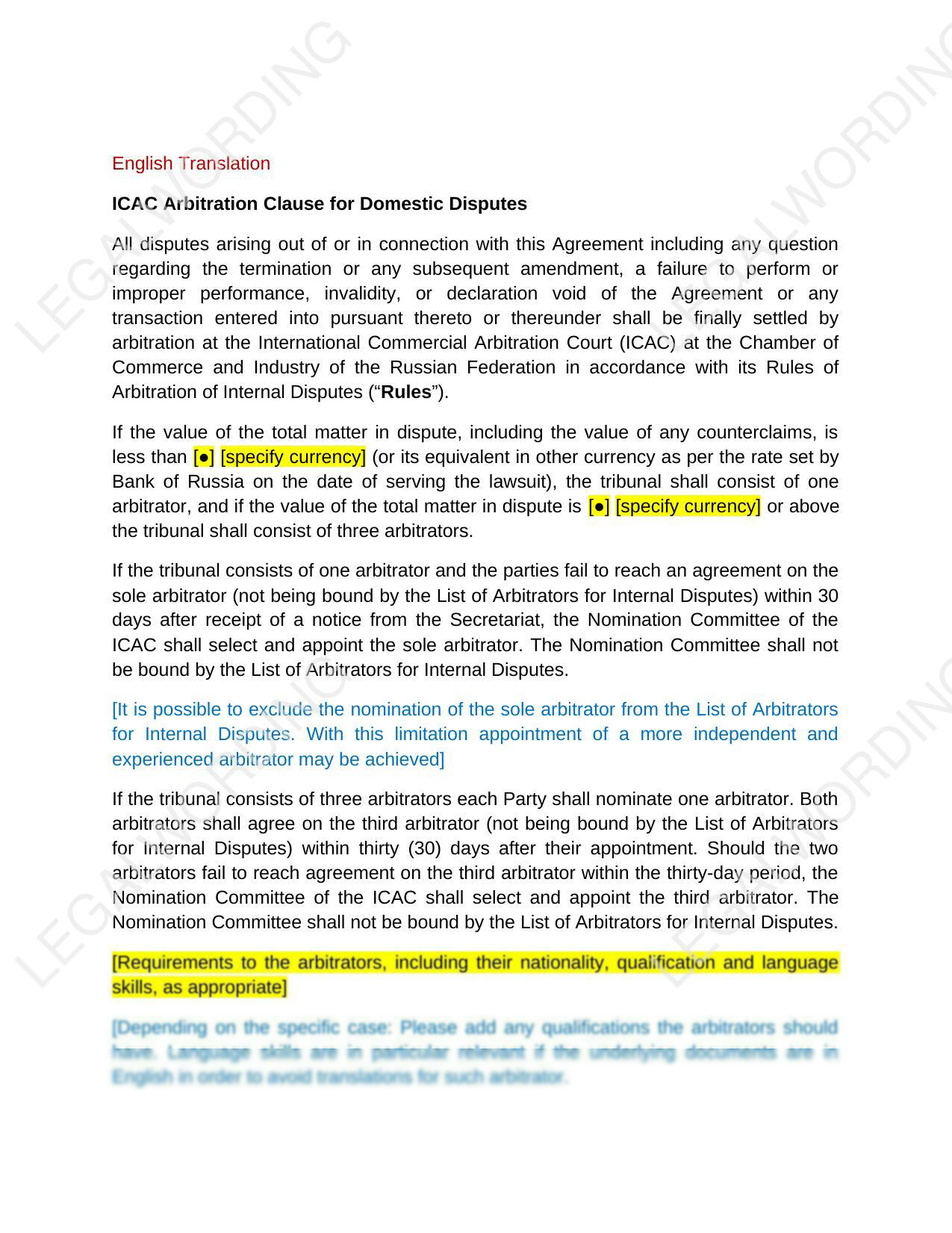 The International Commercial Arbitration Court (ICAC) arbitration clause establishes the procedure for resolving disputes between parties to a contract. The clause is based on the ICAC's recommended clause available on its official website and has been finalized in the following aspects: