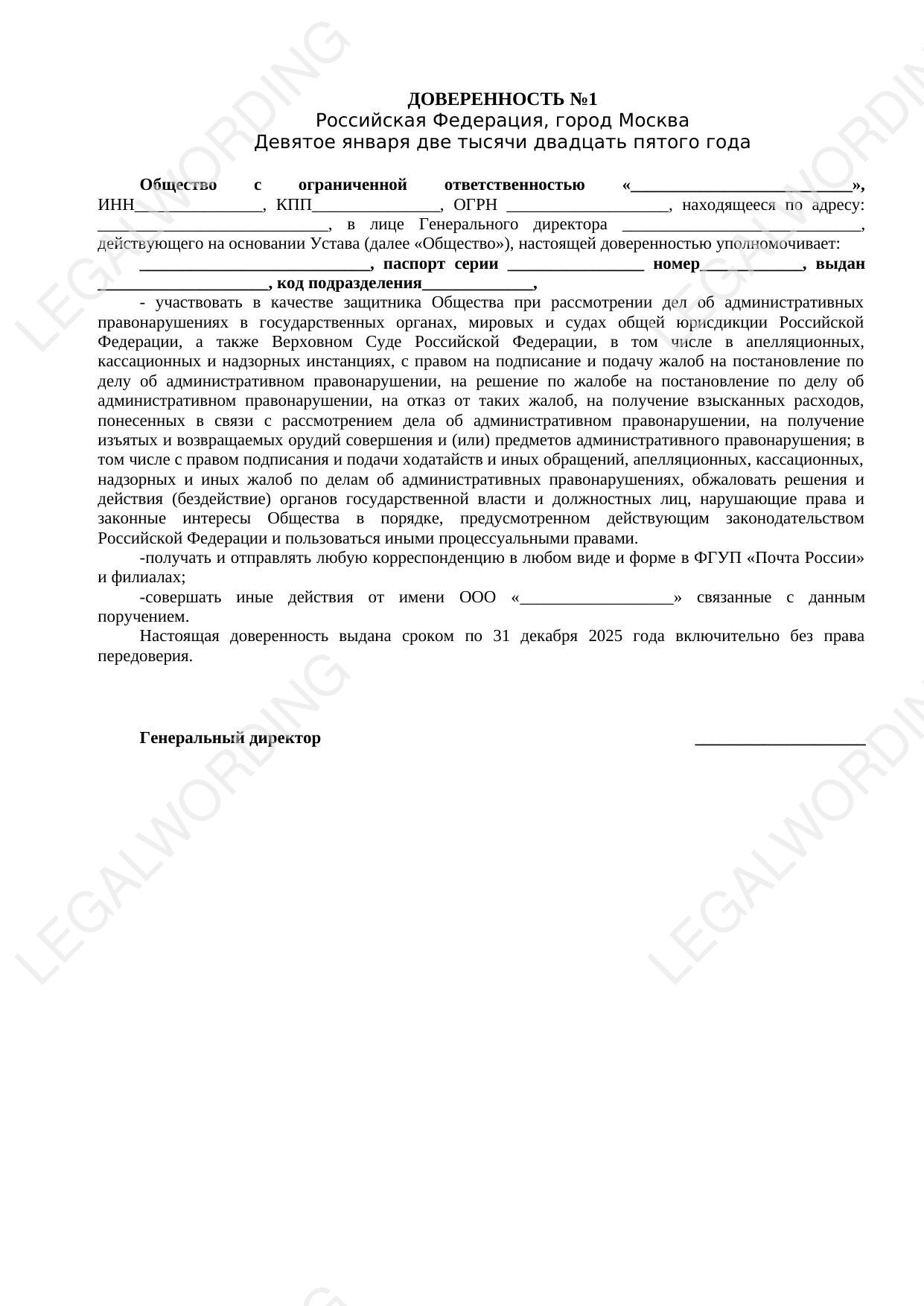 A power of attorney from a legal entity to protect interests in cases of administrative offenses in courts of general jurisdiction, including the Supreme Court of the Russian Federation.
