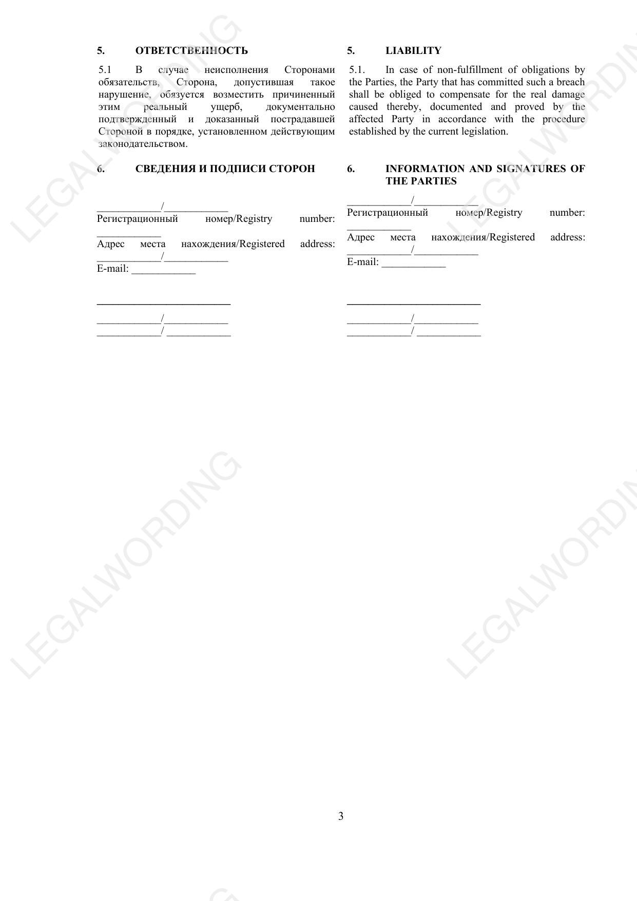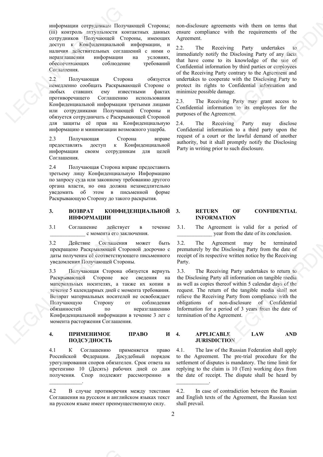 A template for a confidentiality agreement concluded between legal entities. The template is designed for use in both Russian and English languages. The document covers important points: 1. The subject of the agreement defines the concept of confidential information and the obligations of the parties to protect it. 2. Protection and access to confidential information - establishes measures to keep confidential information safe and the procedure for its use. 3. Return of confidential information - describes the procedure for the return of confidential information and non-disclosure obligations after the expiration of the agreement. 4. Applicable law and jurisdiction - indicates which legislation is applied and in which court disputes are considered. 5. Liability - defines the terms of compensation for damages in case of breach of obligations. The agreement provides for bilingual design for international use and contains provisions on liability and ways to protect confidential information