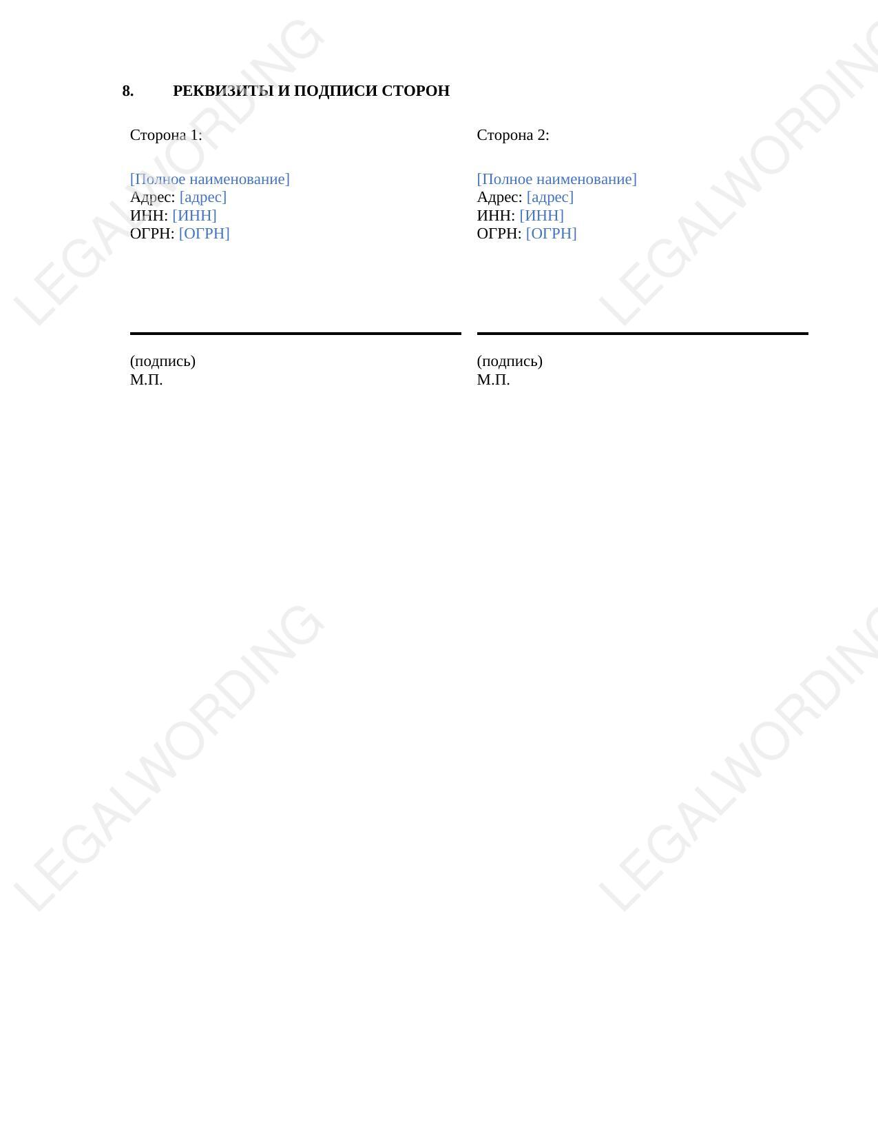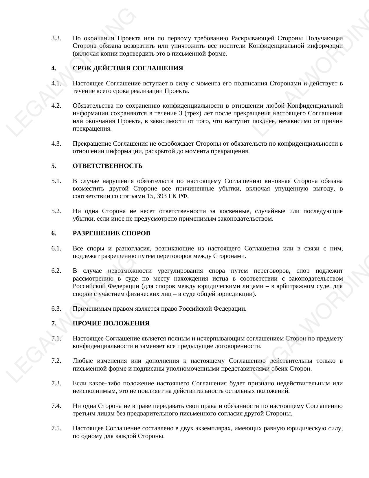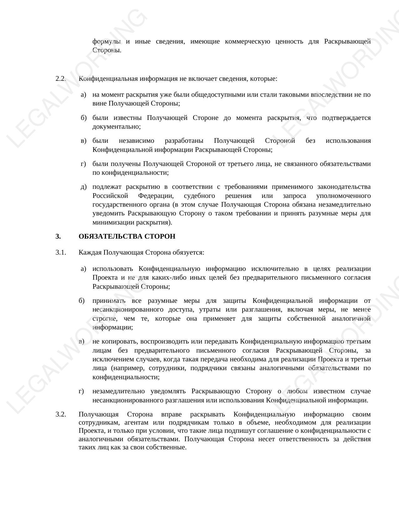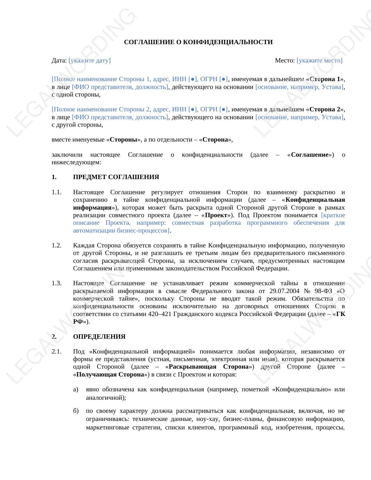 This confidentiality agreement is a contractual template designed to regulate relations between parties exchanging confidential information within a joint project, without establishing a formal trade secret regime under Federal Law No. 98-FZ.
