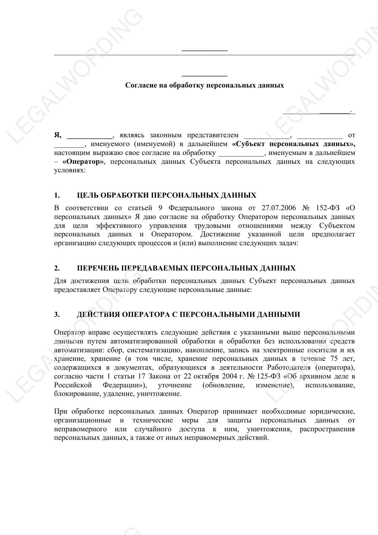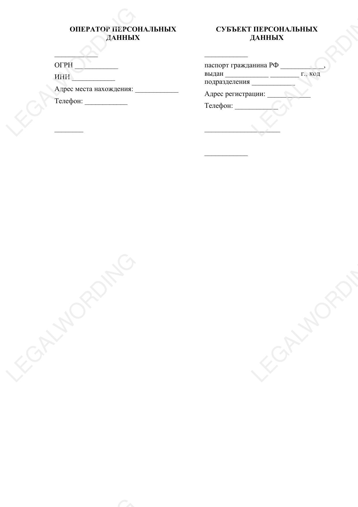 A template for consent to the processing of personal data provided for use between the Operator and the Subject of personal data. This template contains key sections that take into account the norms of the legislation of the Russian Federation and ensure reliable protection of personal data.