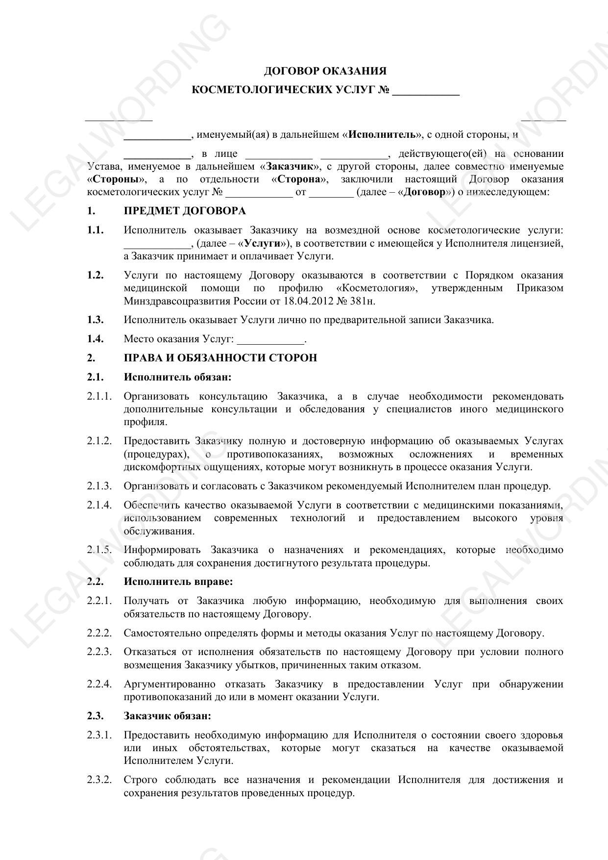 The agreement regulates the nuances of the provision and payment of cosmetology services, the interaction of the parties and protects their rights in case of disputes