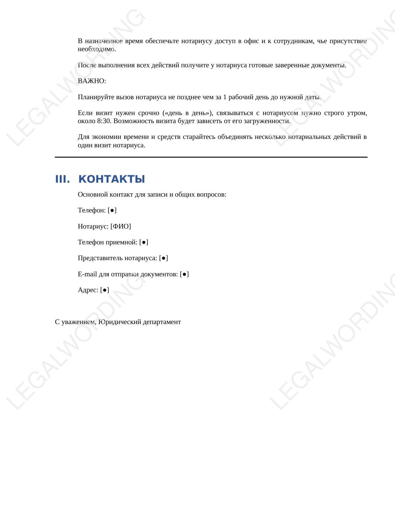 A ready-made "Contacts" section that you can easily customize with your preferred notary's details.