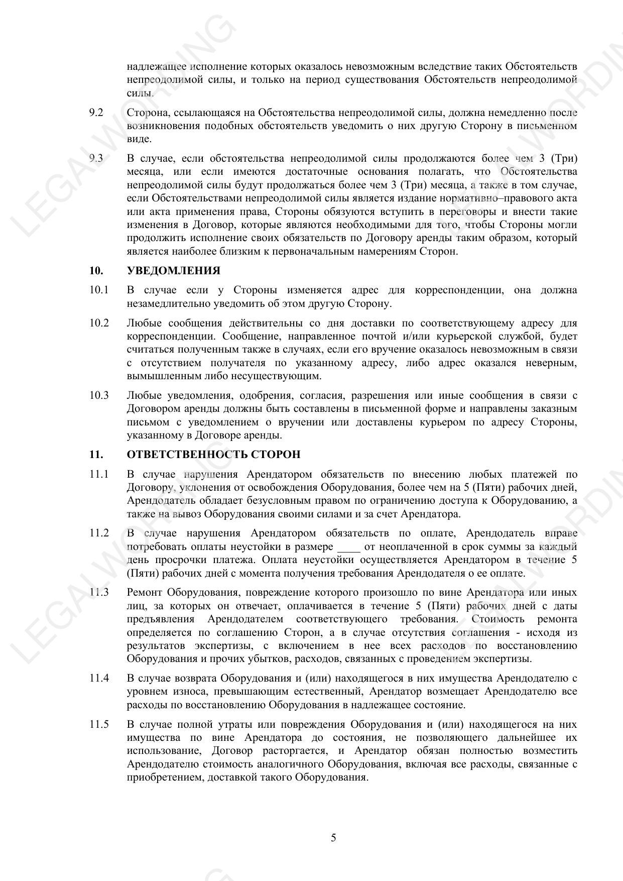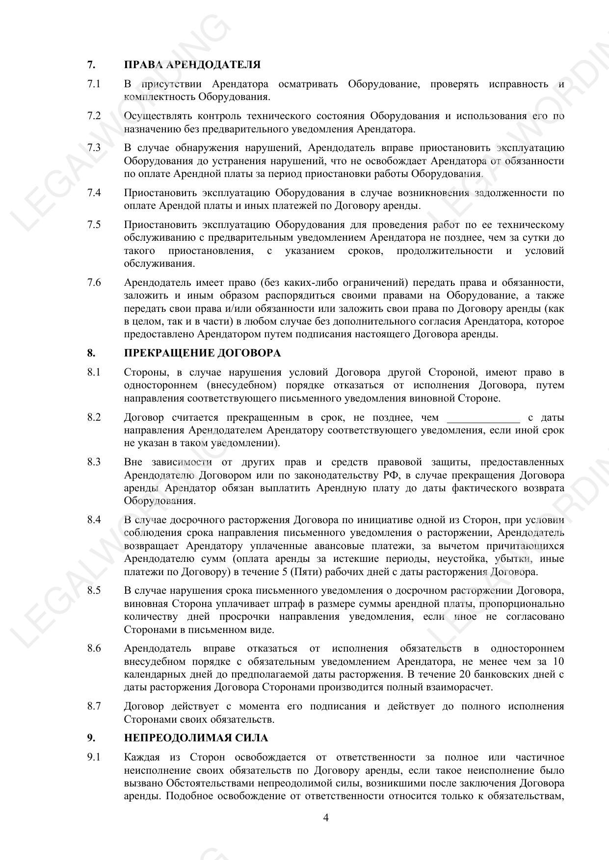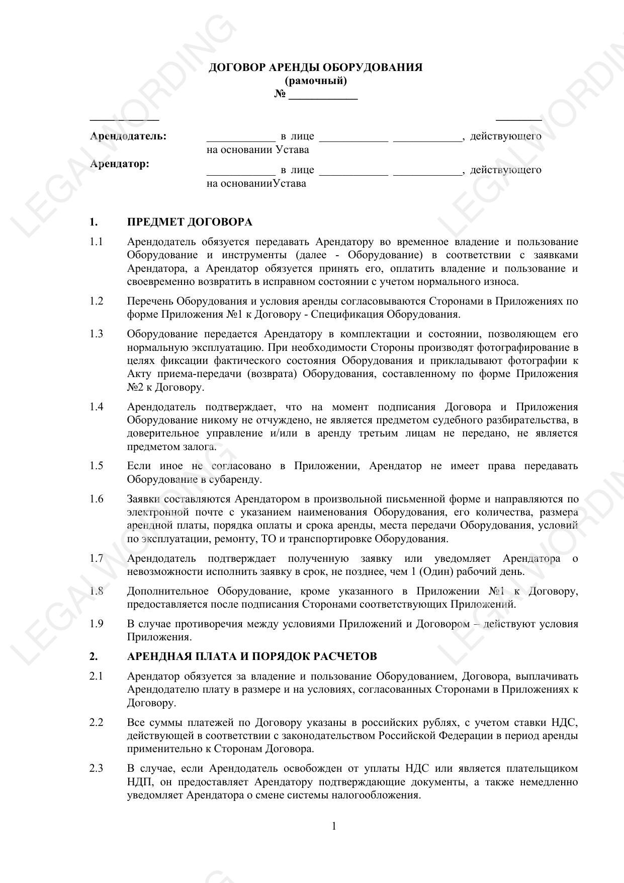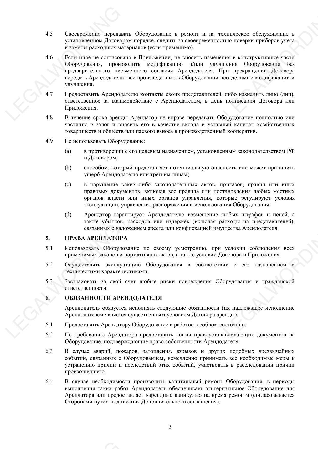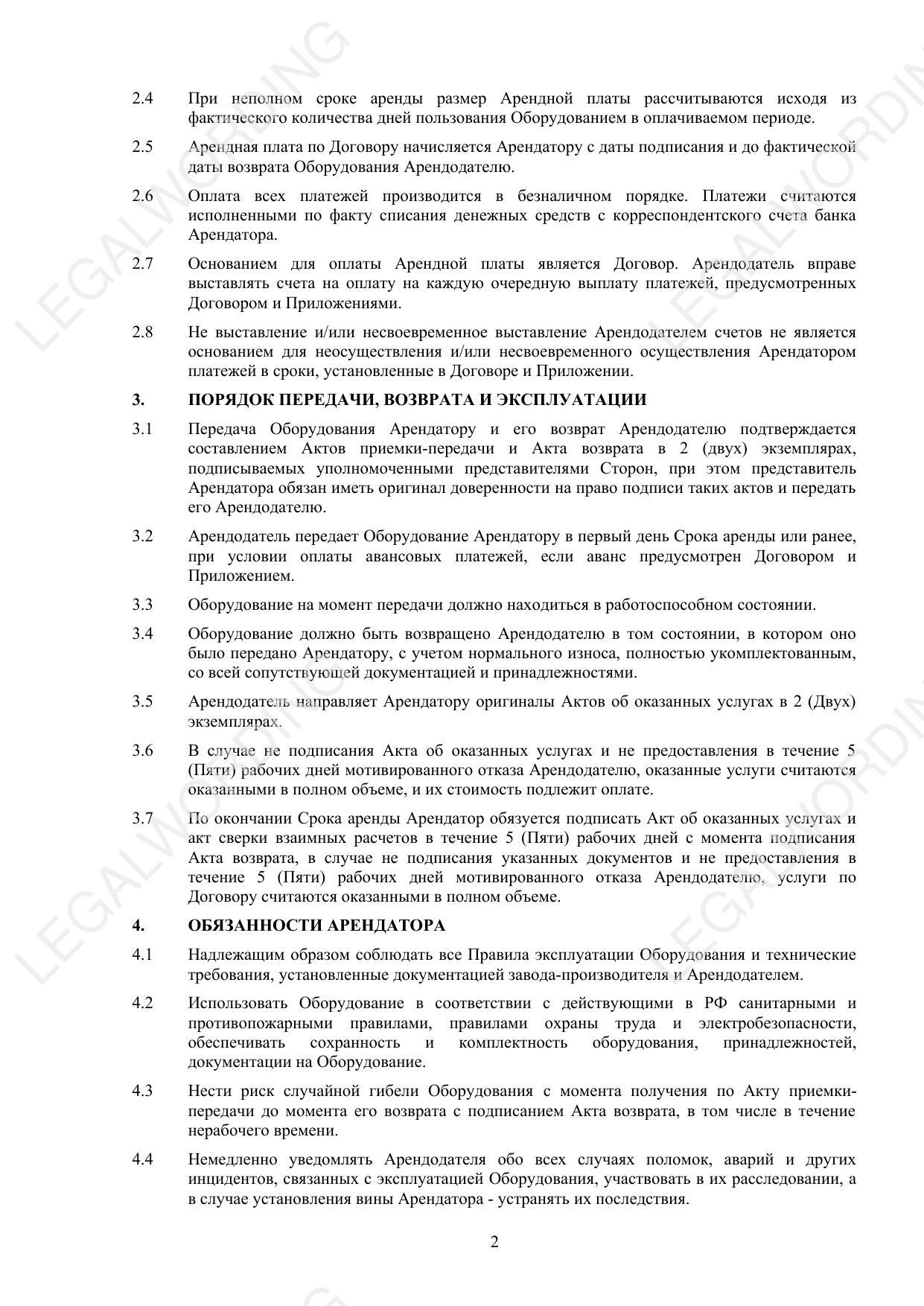 This agreement regulates the issues of temporary ownership and use of equipment, payment procedures, requirements for operation and return, and also contains provisions on liability of the parties and dispute resolution