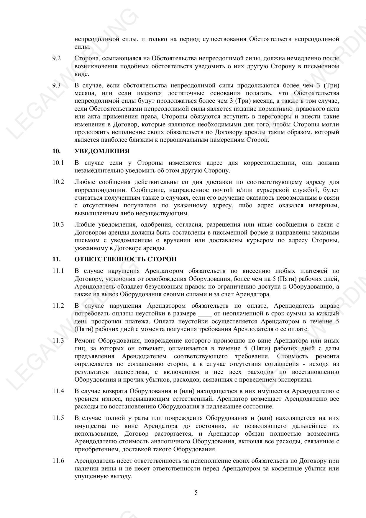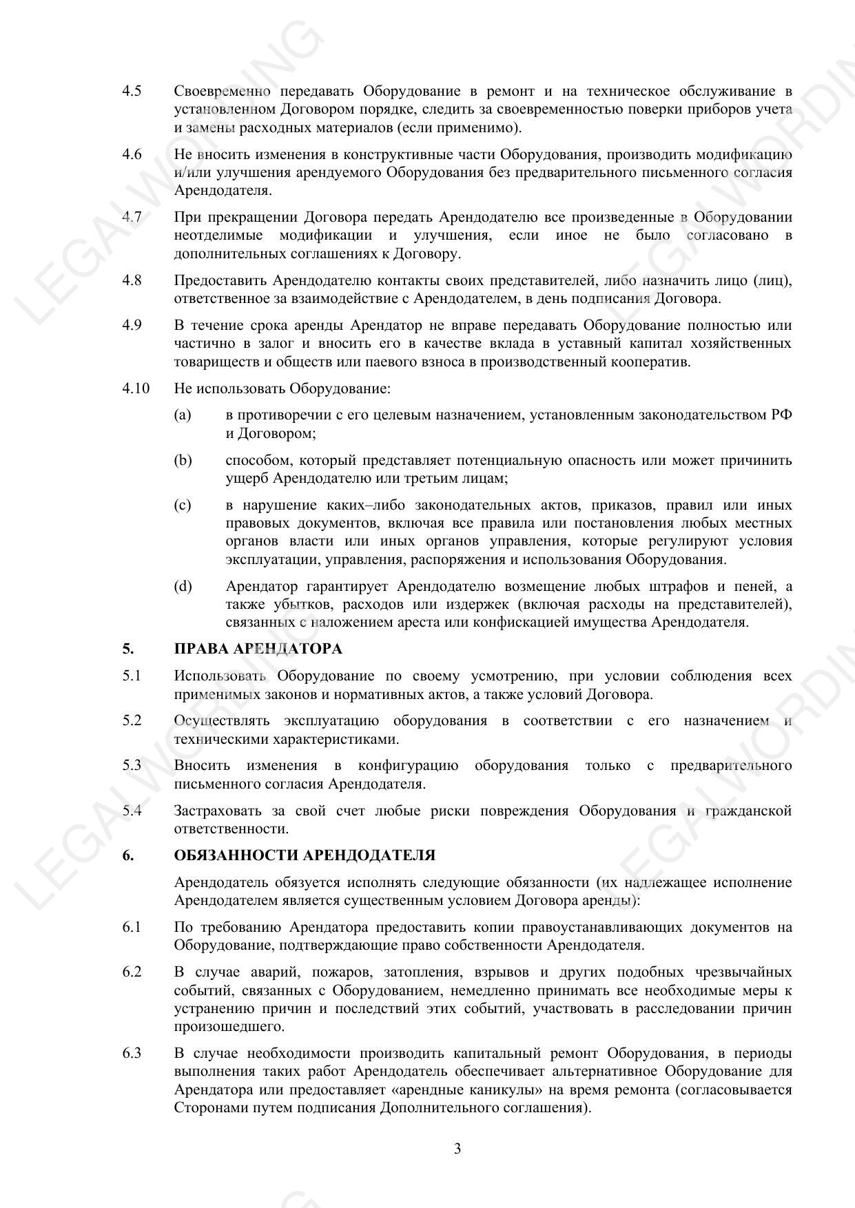 The agreement regulates all the nuances of equipment rental, payment, and interaction between the parties and contains provisions on liability and dispute resolution procedures, thereby guaranteeing the protection of the interests of both parties