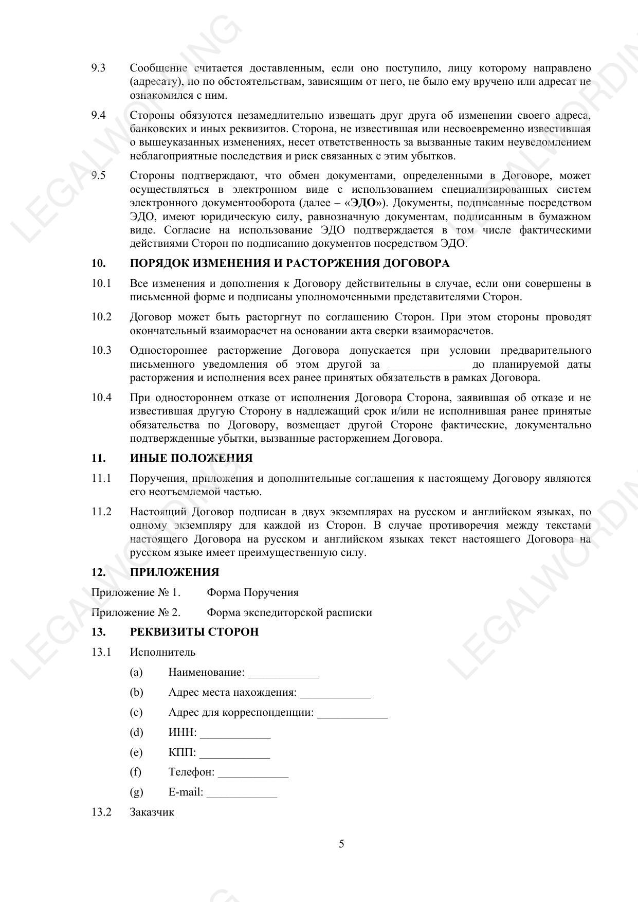 The template includes the forms of the order and forwarding receipt as appendices, which are an integral part of the contract. The document regulates in detail the interaction of the parties at each stage of the provision of freight forwarding services