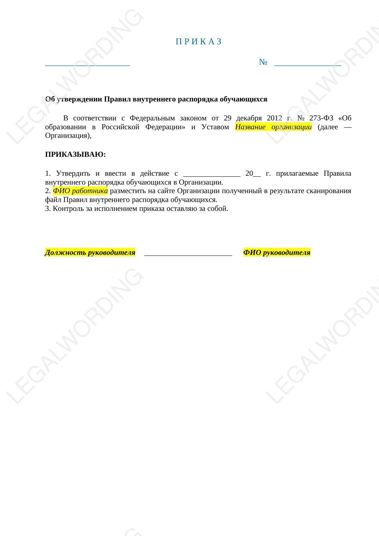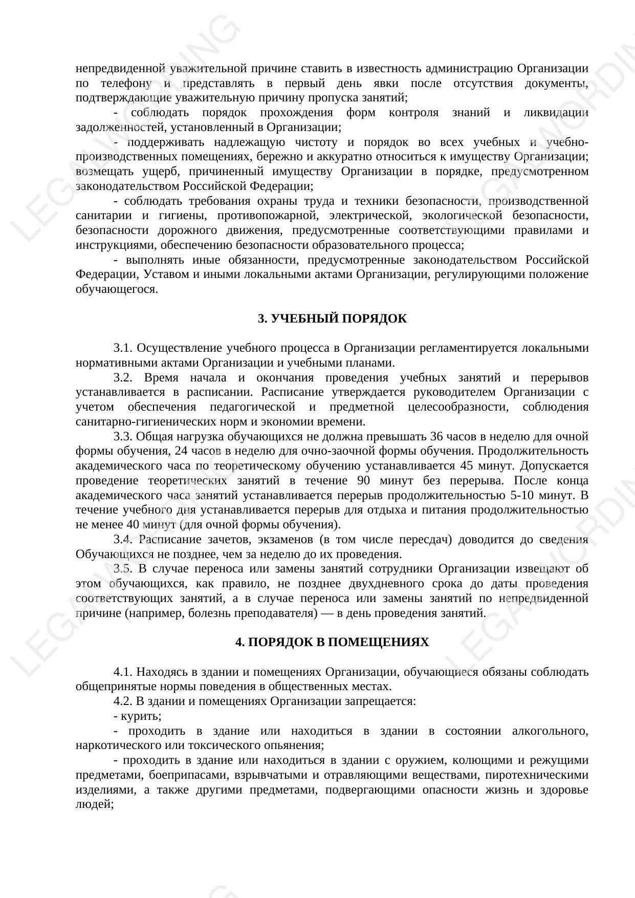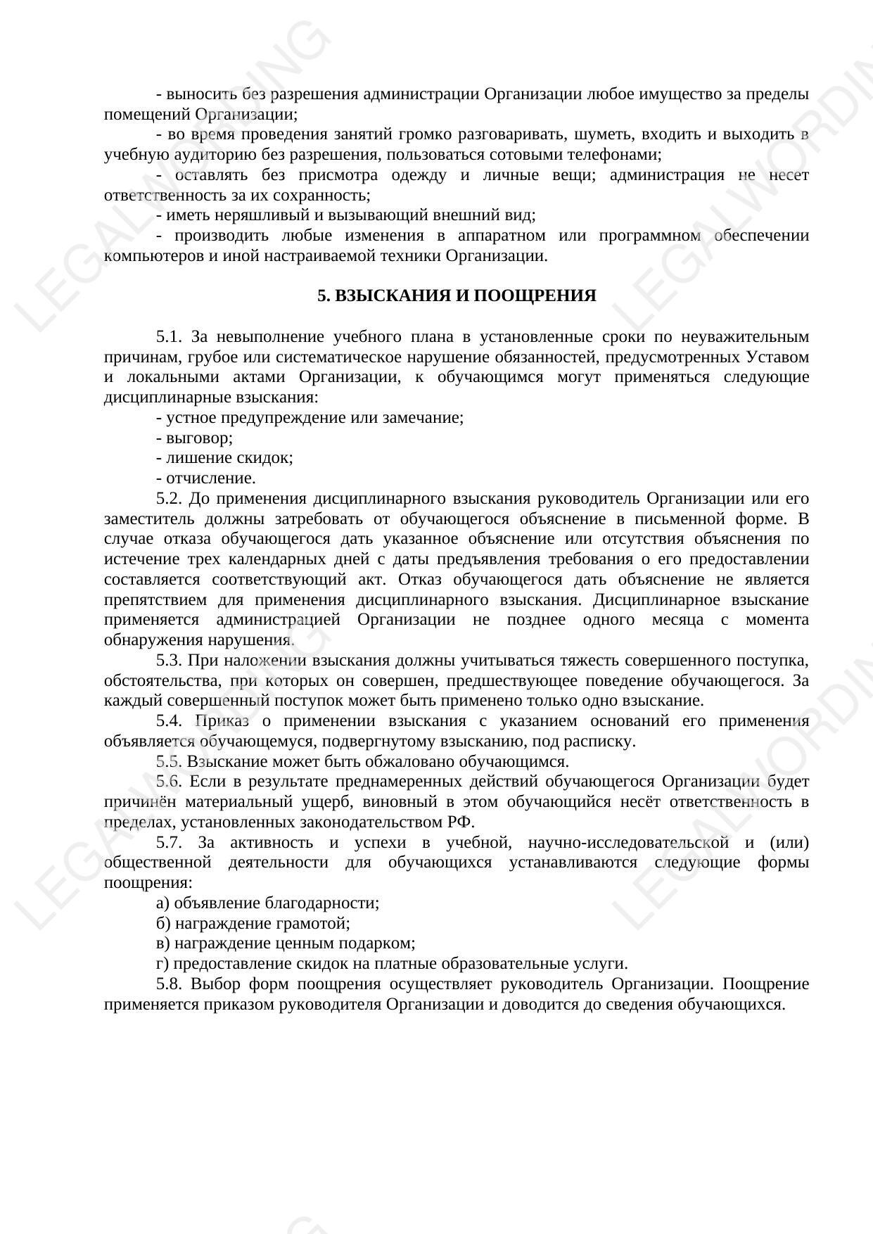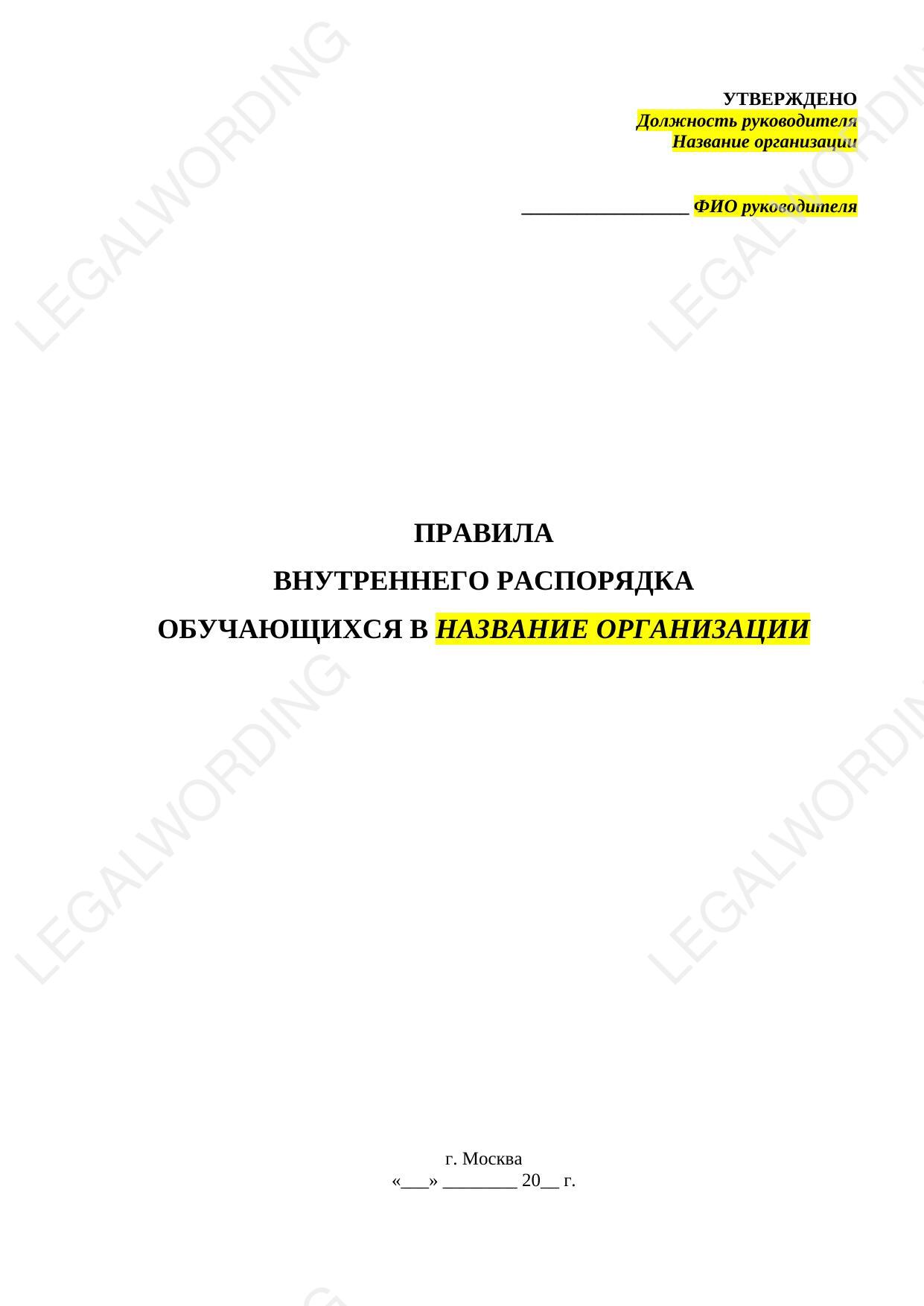 The internal regulations for the students and the order for their approval. This LNA regulates the rights and obligations of students, the educational order and the order in the premises of the educational organization, the issues of penalties and rewards.