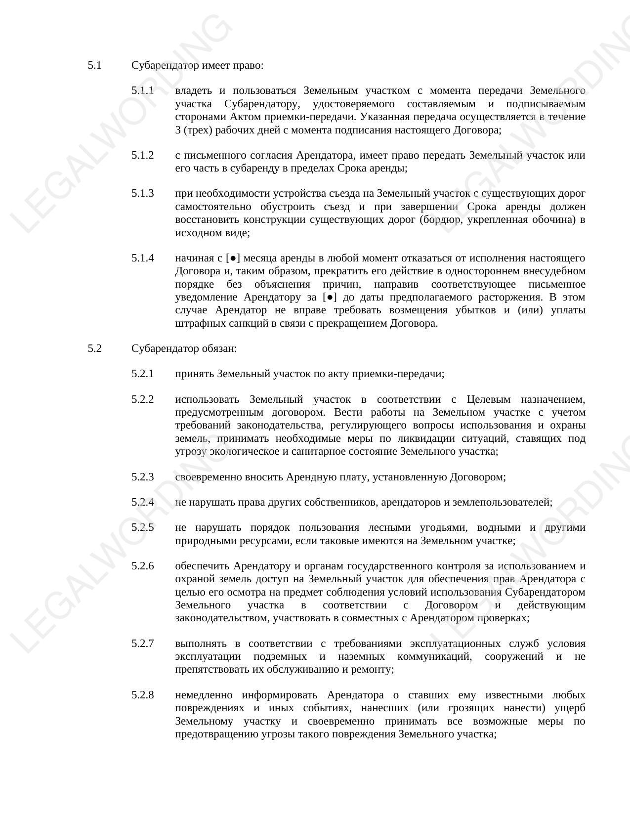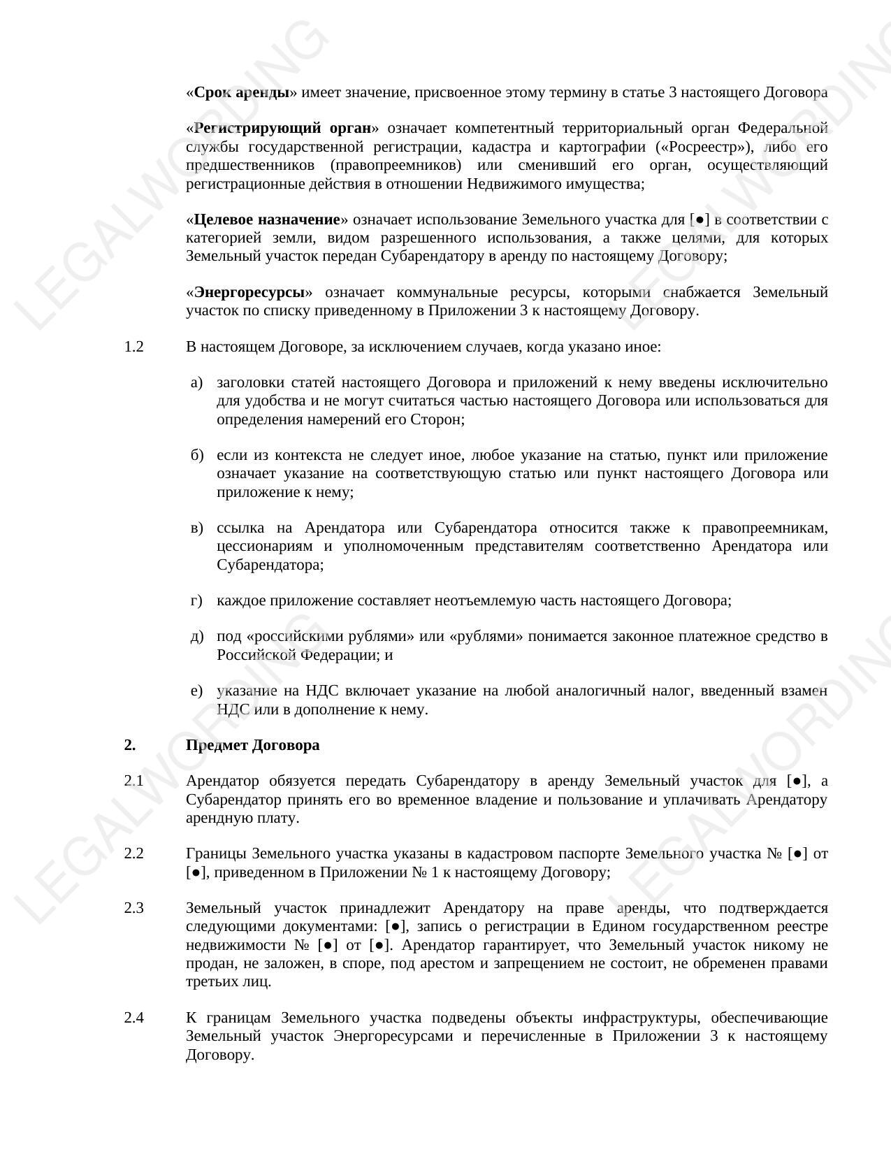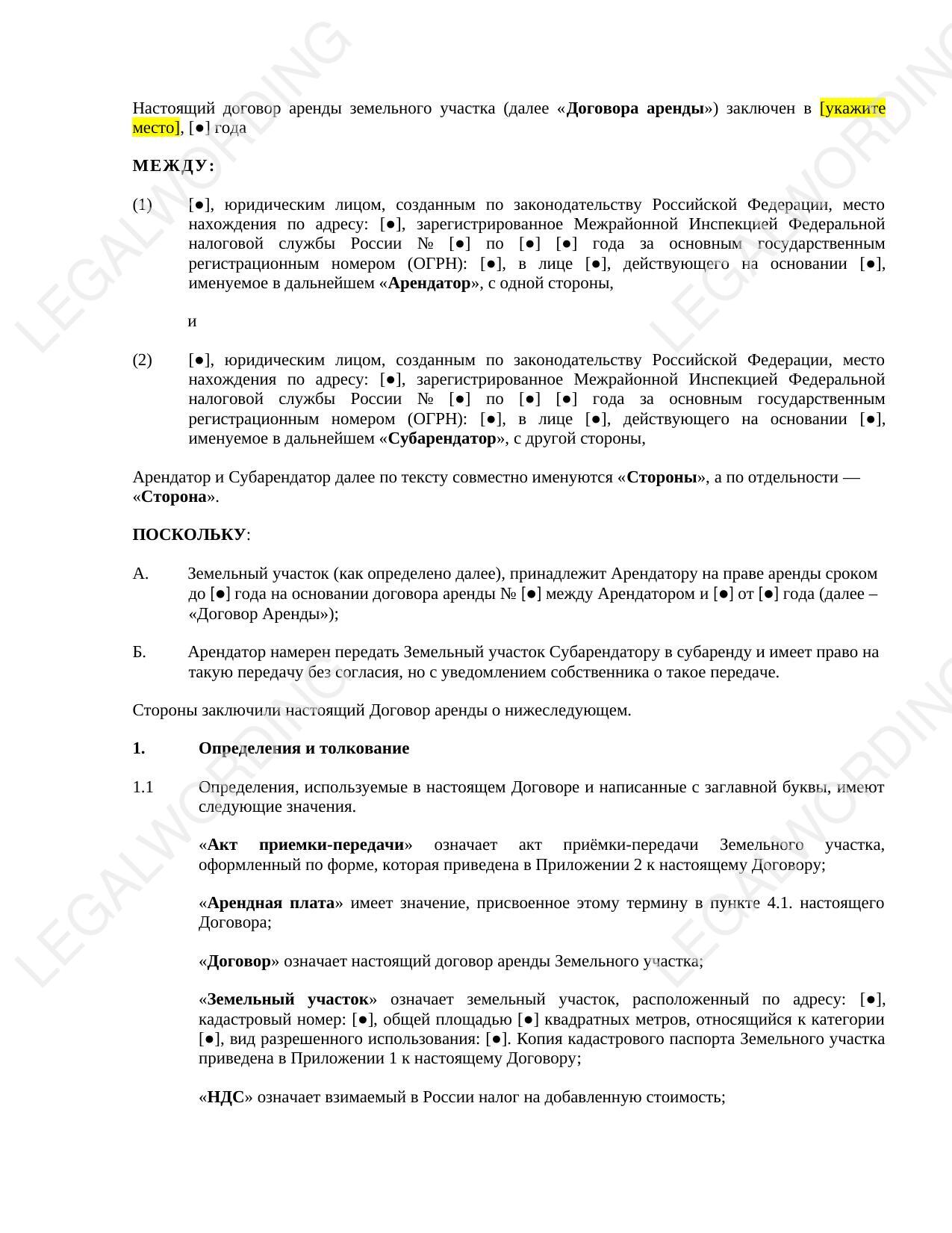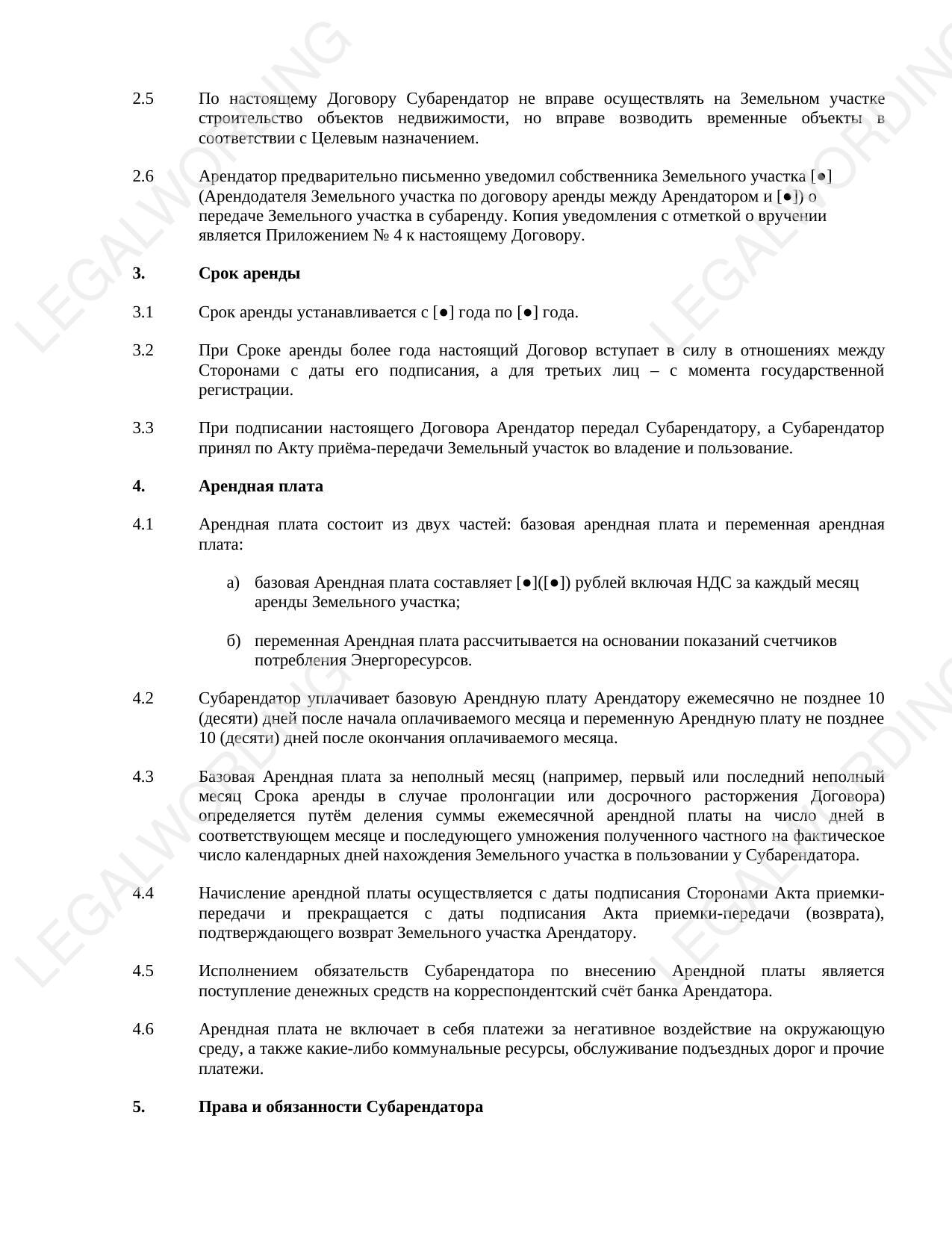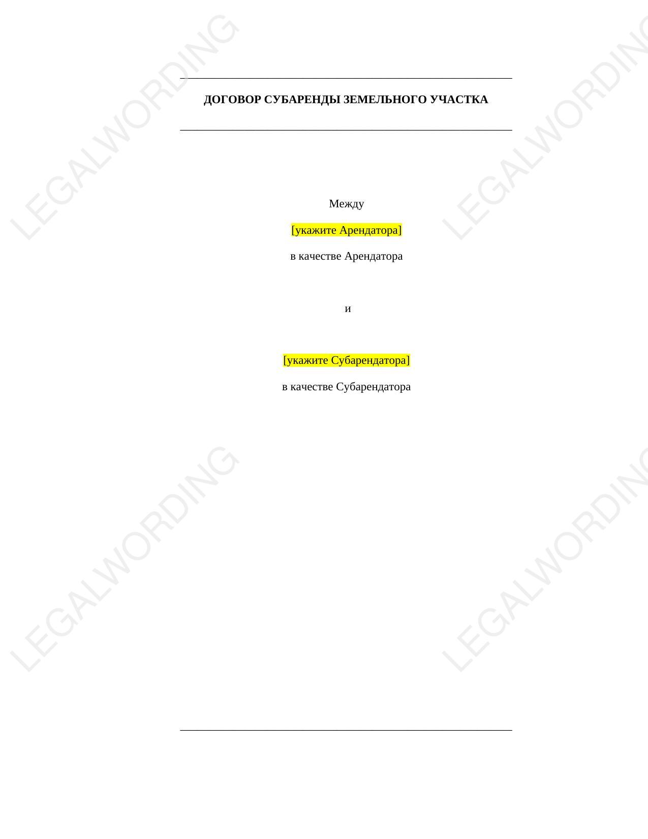 The general form of the land plot sublease agreement may be used for various sublease purposes (sublease of a land plot for parking, temporary pavilions, warehouse, for organizing access to another plot, and other purposes).