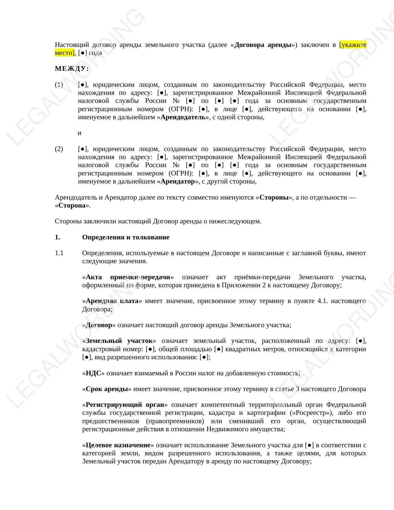 The general form of a lease agreement for a part of a land plot can be used for various lease purposes (lease of a land plot for parking, temporary stands, warehouse, for organizing access to another land plot, and other purposes).