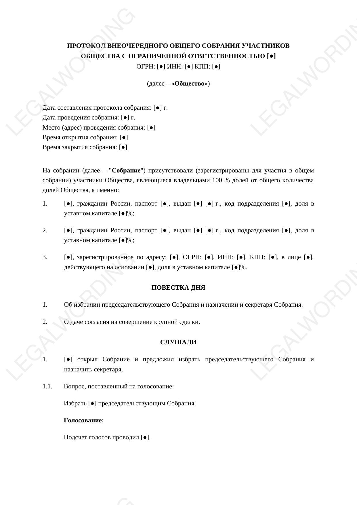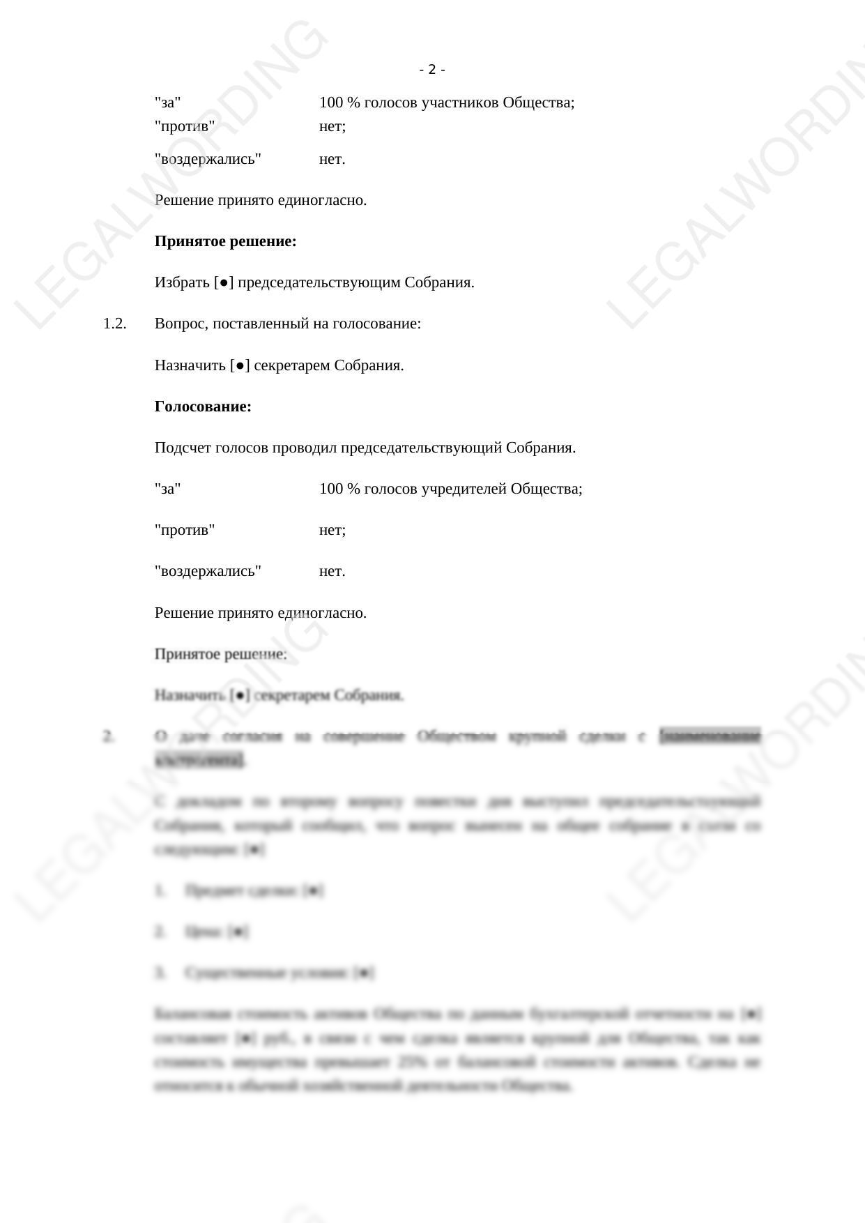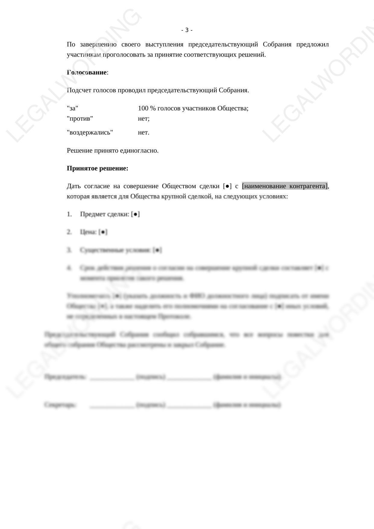 Minutes of the general meeting of participants on the approval of a major transaction is a mandatory document for the legal execution of transactions exceeding 25% of the book value of the company's assets and going beyond the normal business activities.