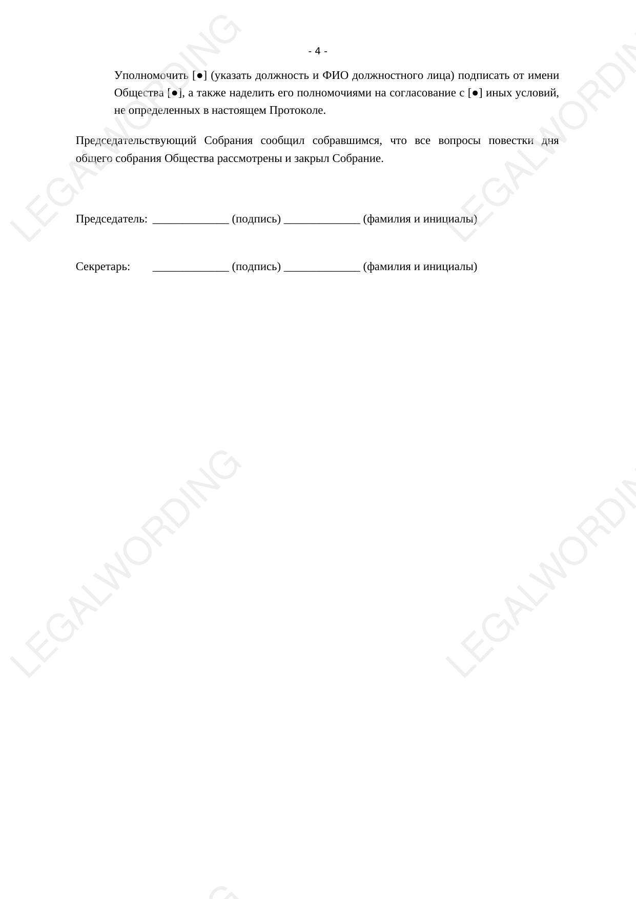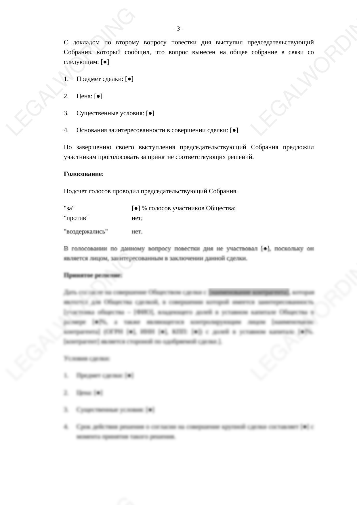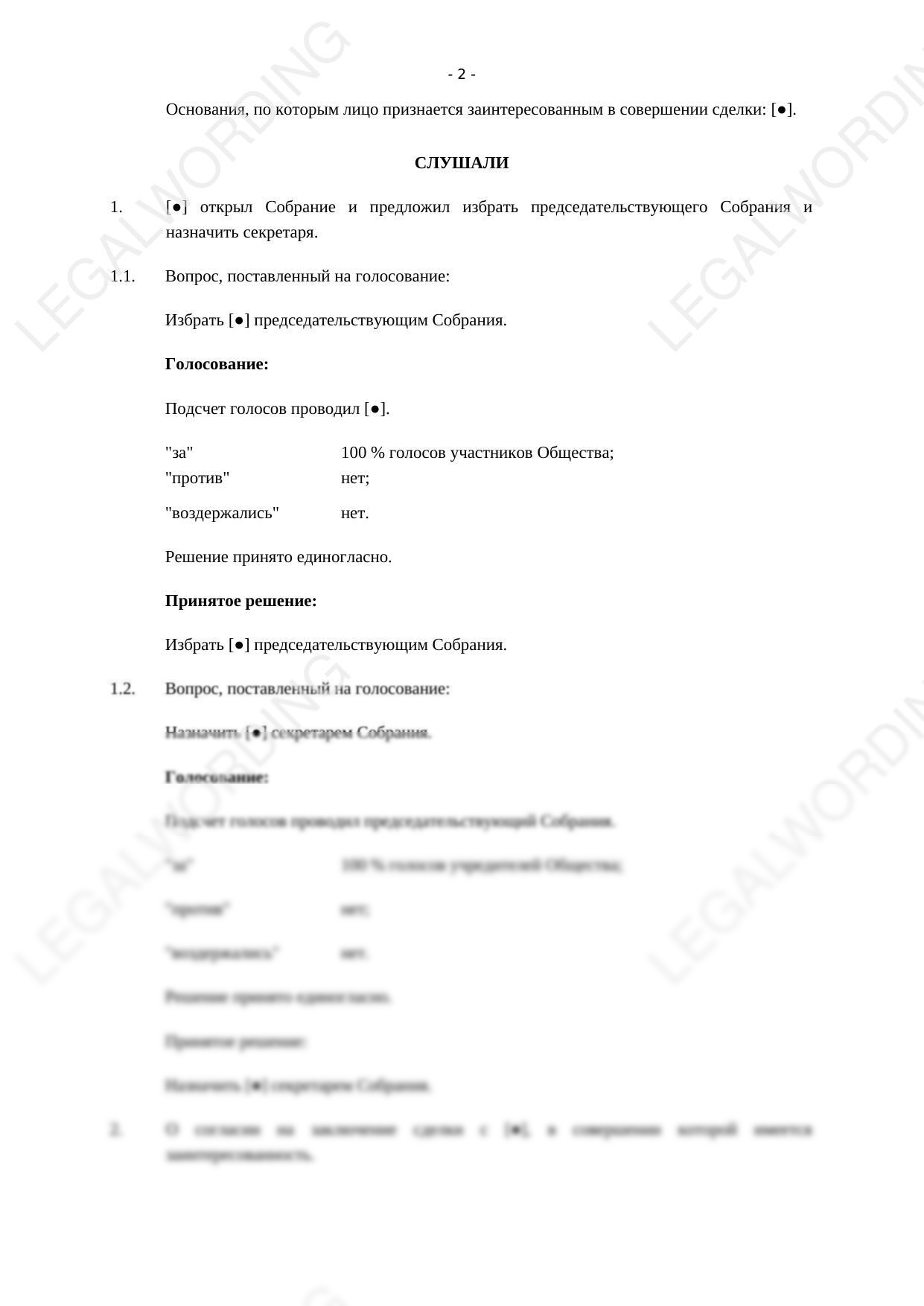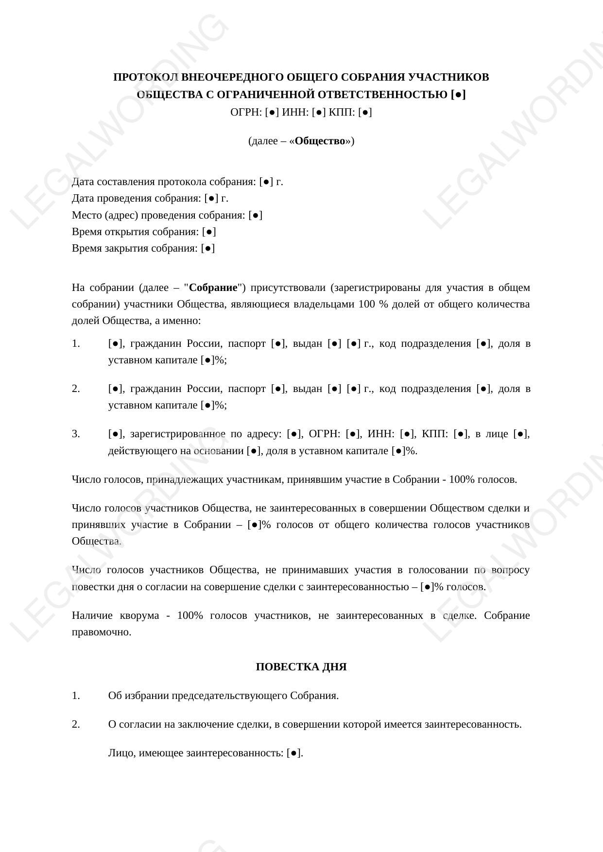 Minutes of an extraordinary general meeting of participants are required to formalize consent to a related-party transaction. According to the Federal Law “On Limited Liability Companies”, an interested party transaction is a transaction in which a member of the Board of Directors, the sole executive body, a member of the collegial executive body or a controlling person of the company is interested.