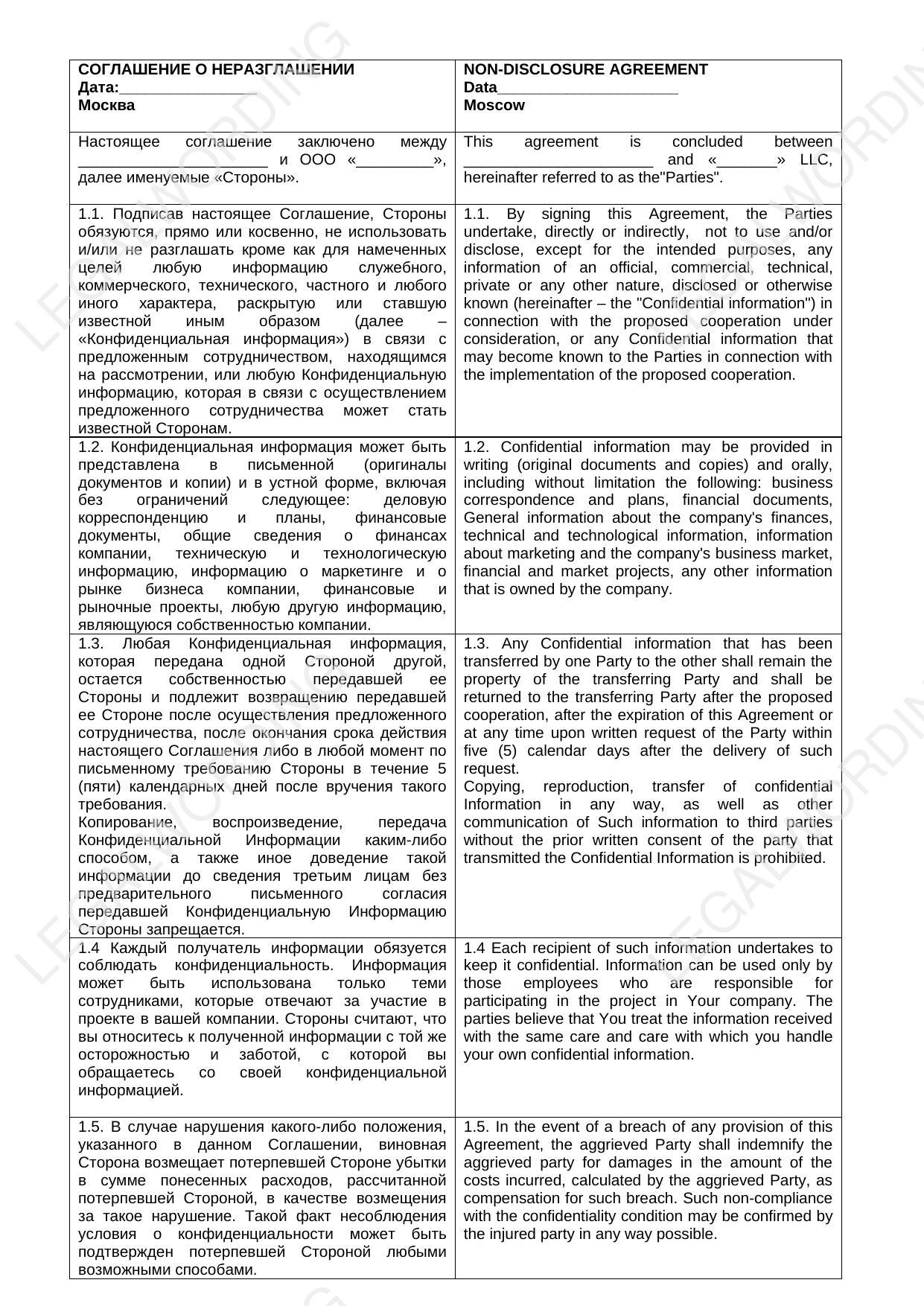 Non-Disclosure Agreement (NDA) in Russian and English. A short version of the terms, for uncomplicated relationships and the prevention of excessive regulation.