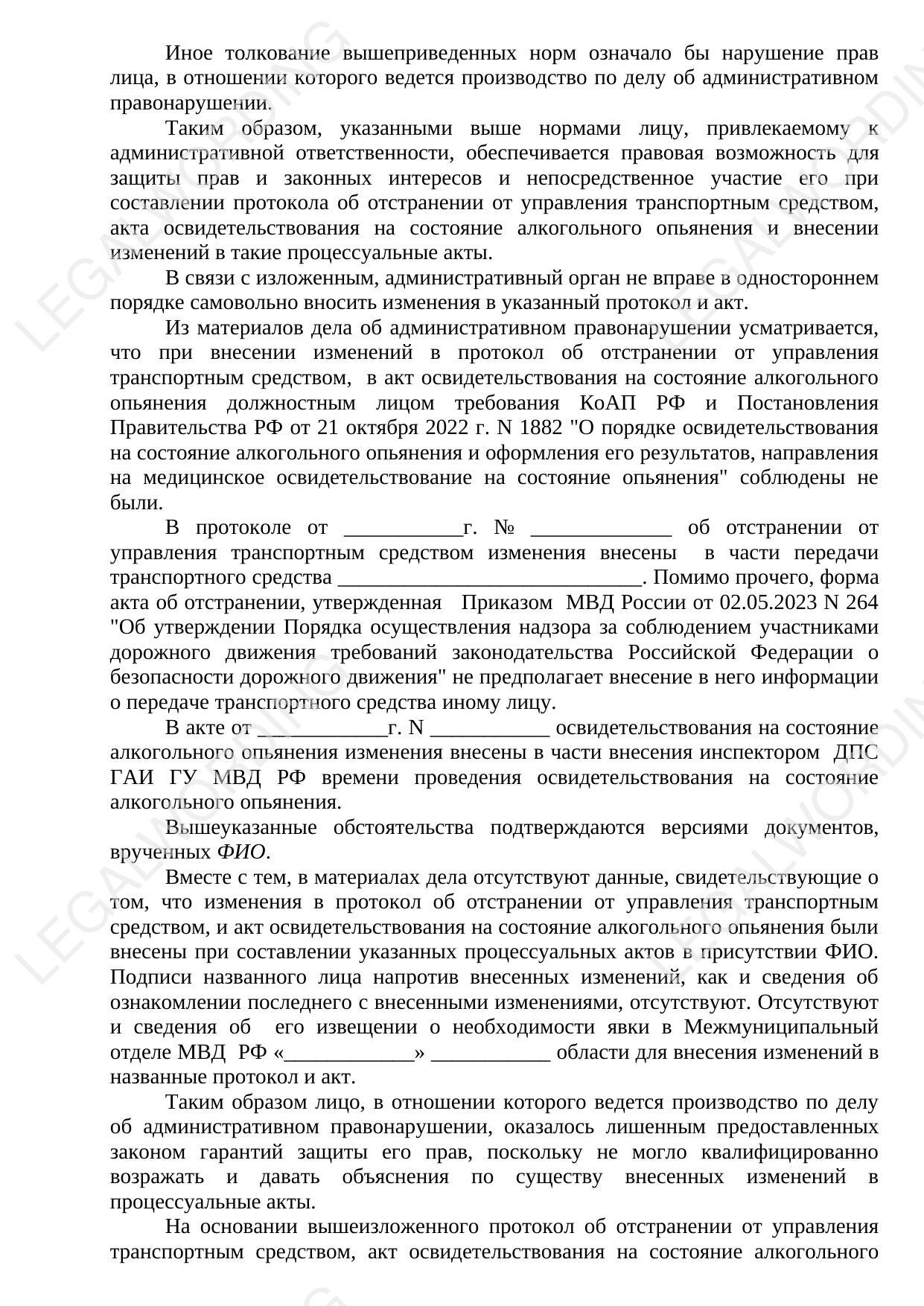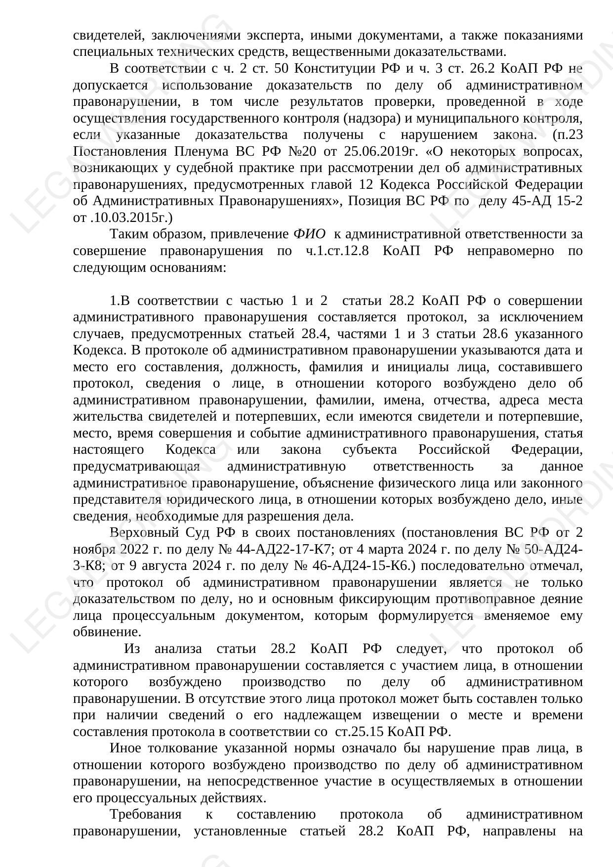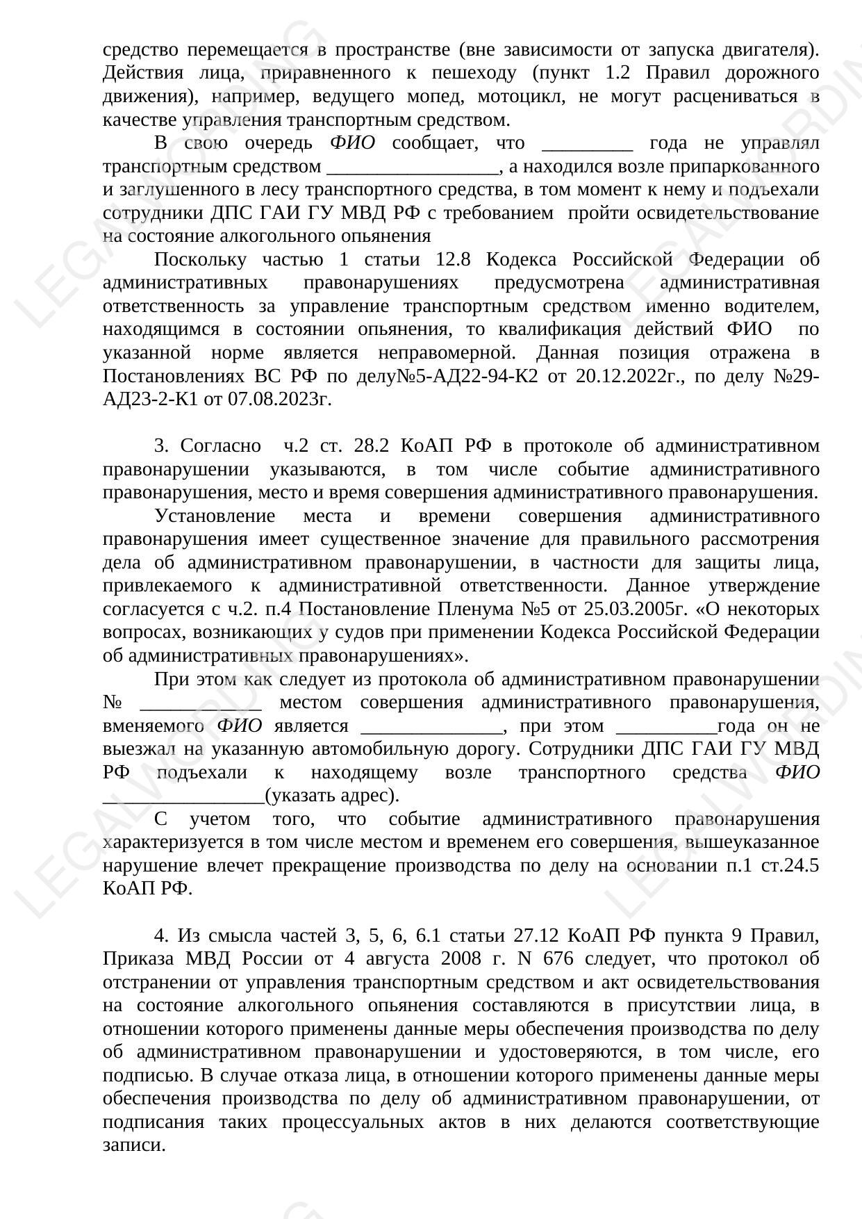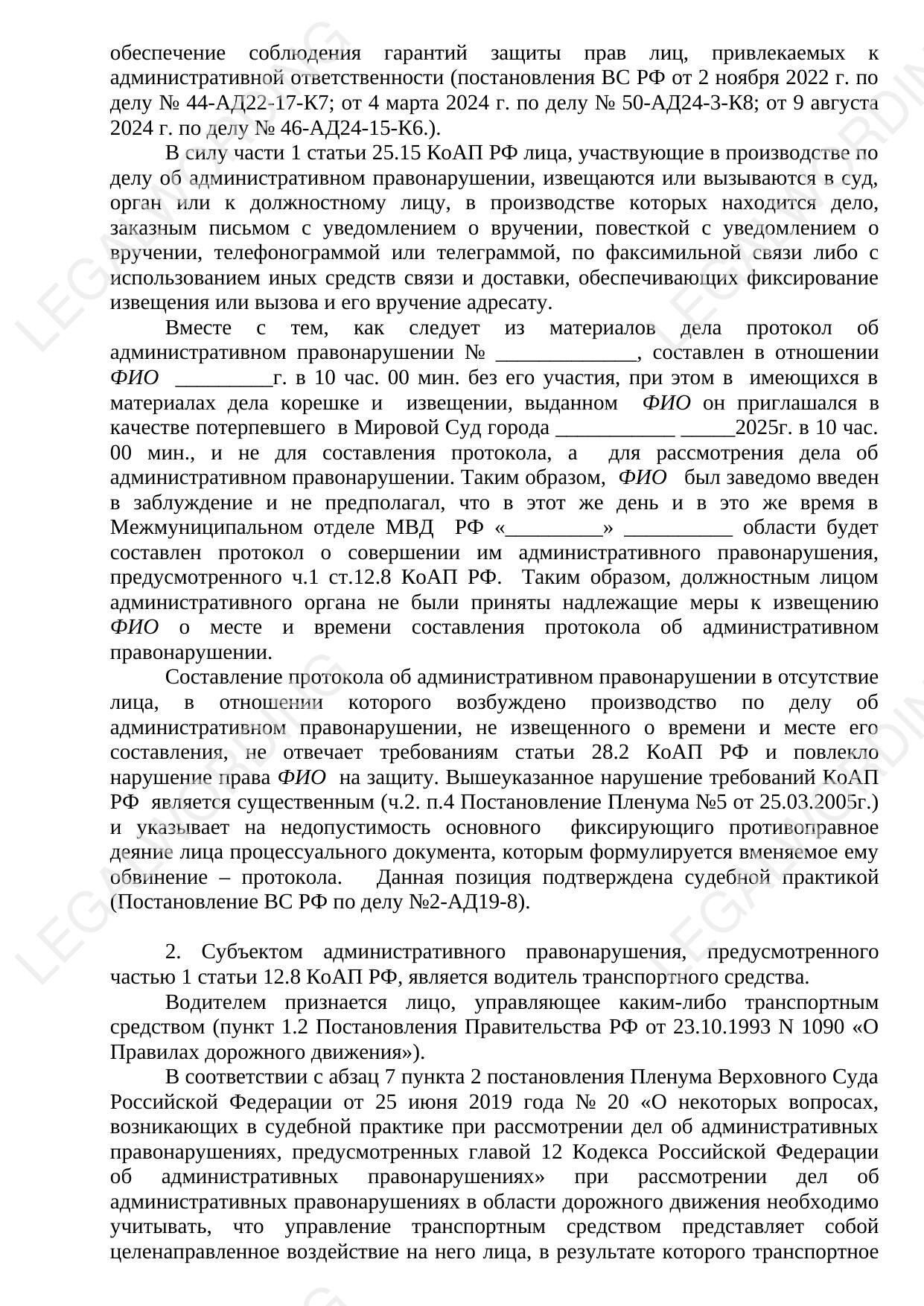 The text contains a reasoned position on the case of an administrative offense under Part 1 of Article 12.8 of the Administrative Code of the Russian Federation, supported by the judicial practice of the Supreme Court of the Russian Federation and the Resolutions of the Plenum of the Supreme Court of the Russian Federation. The following arguments are presented and substantiated: