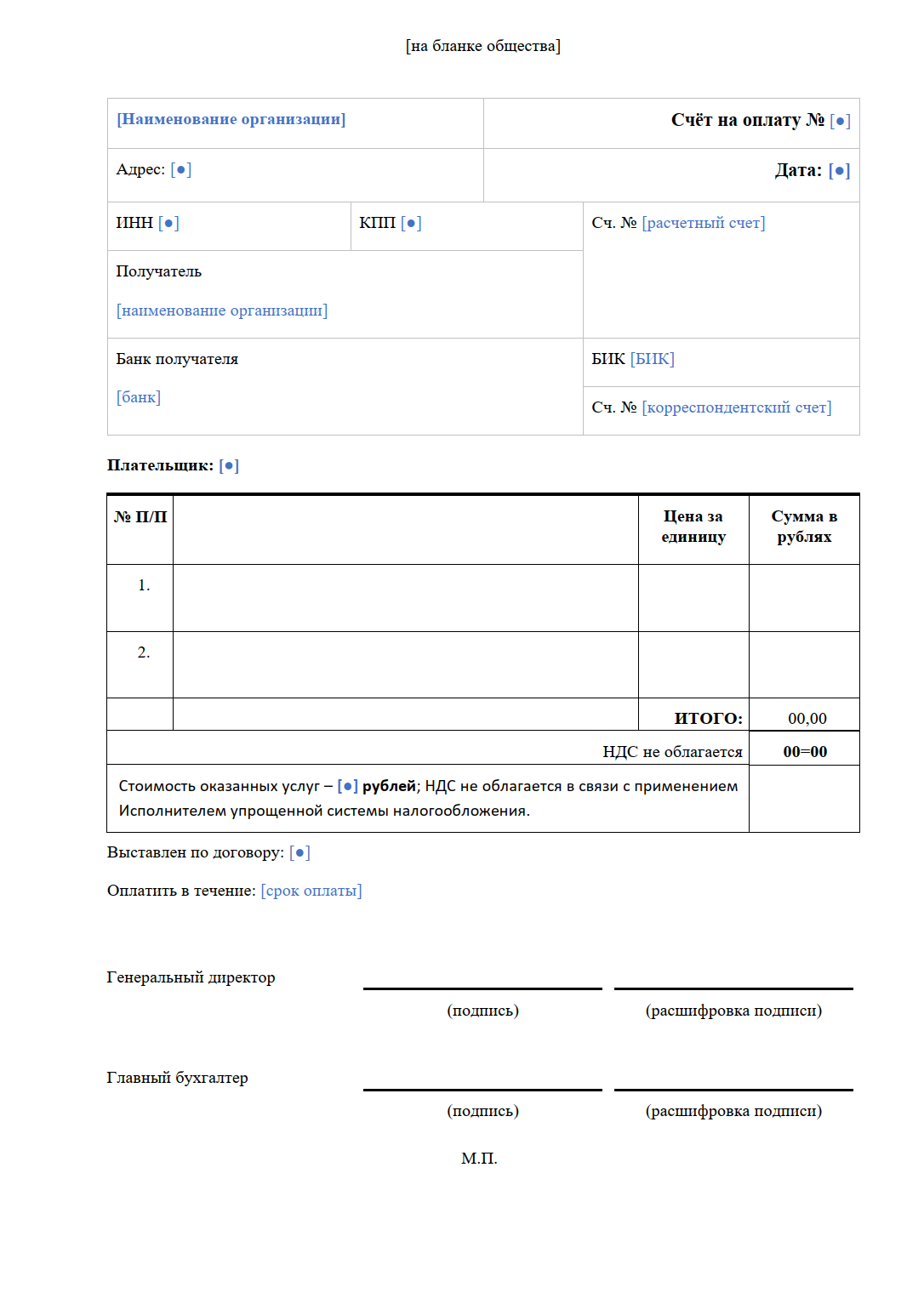 It includes the parties’ details (name, address, tax IDs), the recipient’s bank information (bank name, BIC, correspondent and settlement accounts), invoice number and date, payer, contract reference, line items and totals, payment term, and authorized signatures.