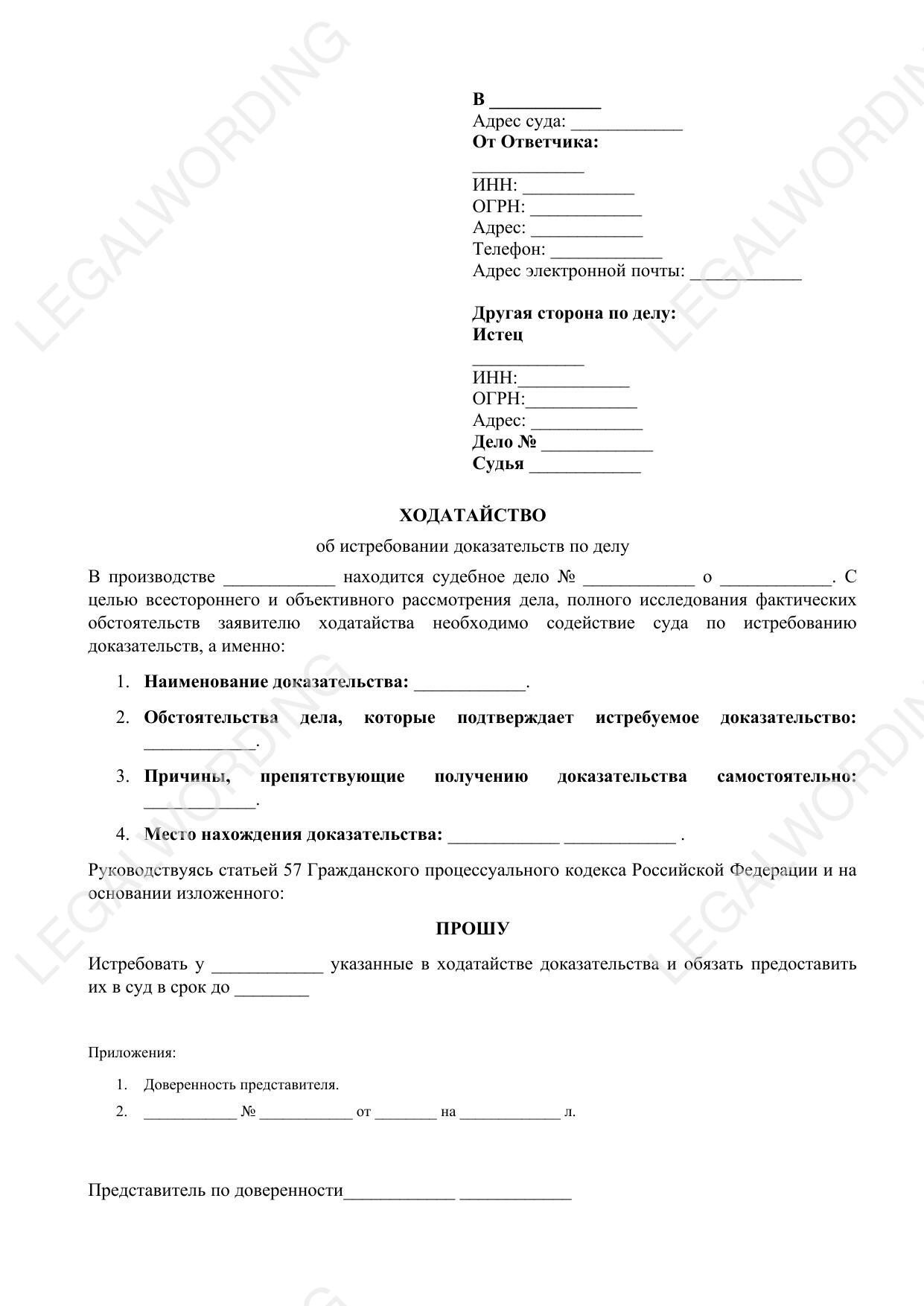 The template of the petition for the reclamation of evidence in the case can be used by legal entities in the course of court proceedings. This document is formed in order to assist the court in obtaining the necessary evidence for an objective examination of the circumstances of the case. The template includes the following basic elements: