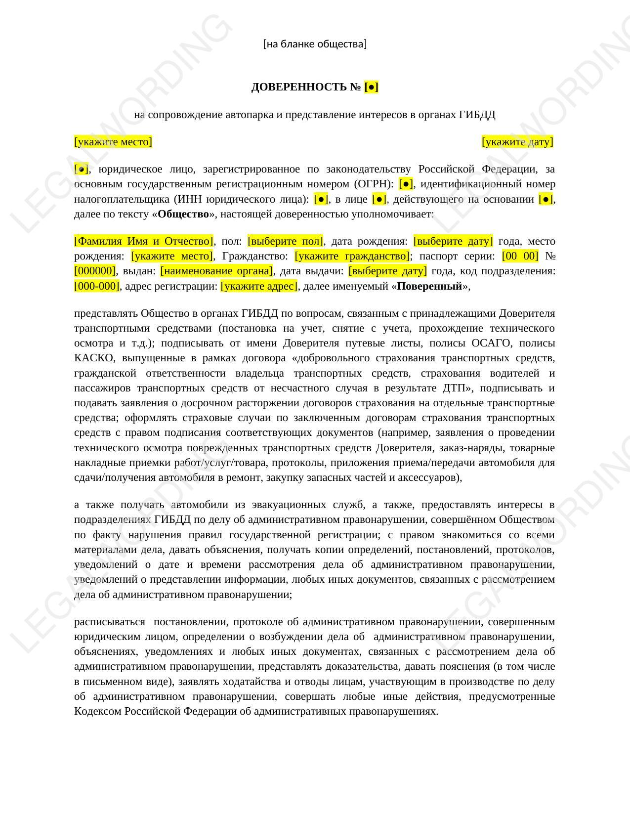 The power of attorney is suitable for transferring powers to employees of the transport department in the company for actions with the fleet of the organization.