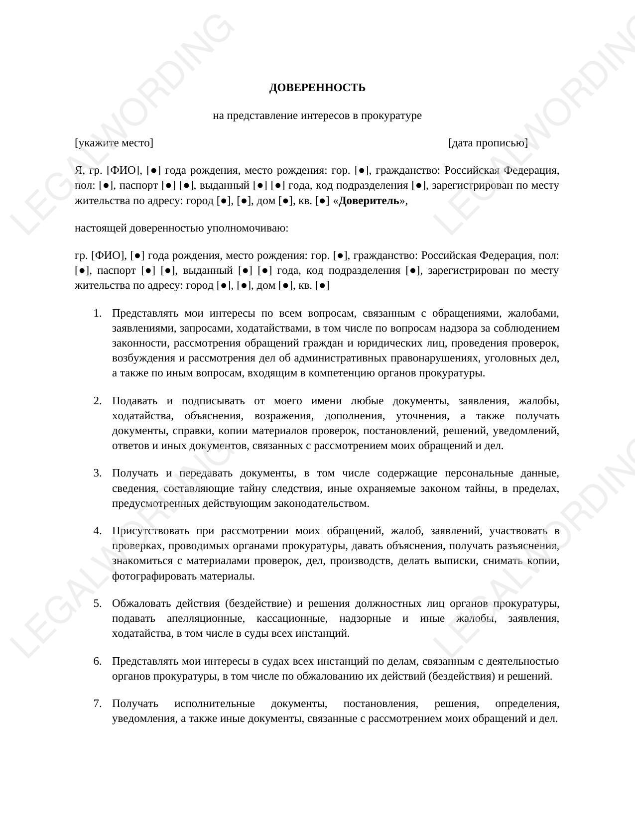 Why is a power of attorney for the prosecutor's office needed? - A power of attorney for the prosecutor's office is necessary to represent the interests of a citizen or organization before the prosecution authorities of the Russian Federation. It authorizes the appointed person (the attorney-in-fact) to act on behalf of the principal: to file complaints, applications, motions; to receive documents; to participate in inspections; to challenge the actions of officials; and to protect the principal's rights in courts regarding matters related to the prosecutor's office's activities.