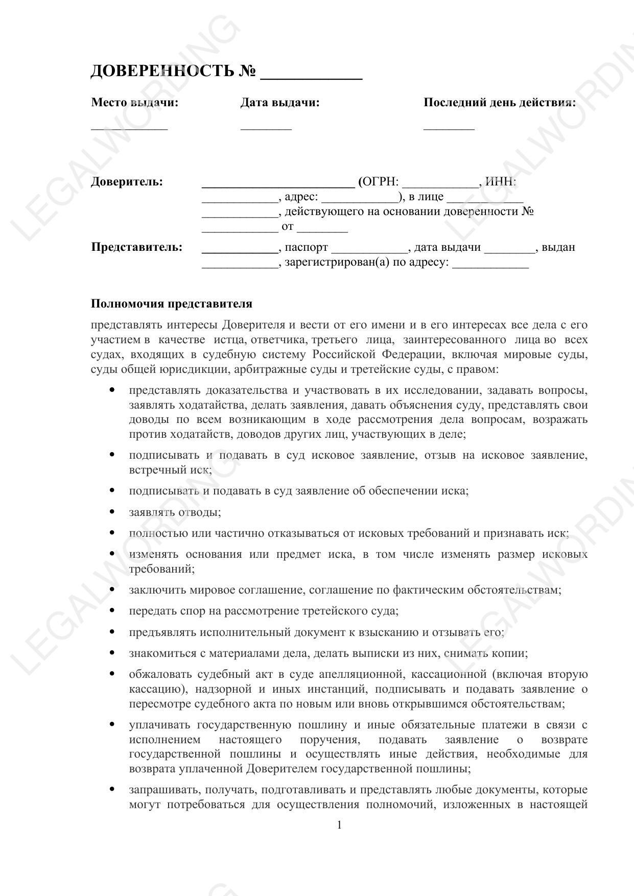 A power of attorney template for representing interests in courts and other bodies. It is intended for delegating authority to a representative on behalf of the principal. The document includes the following sections: Principal - information about the principal, including the OGRN, INN, address and data of the representative. Representative - information about the representative, including passport details and registration address. The representative's authority is a detailed list of actions that the representative has the right to perform. Includes: Representation in courts of all levels, from magistrates to arbitration and arbitration; Participation in procedural actions: filing lawsuits, applications, challenges and petitions, presentation of evidence and their study, conclusion of amicable agreements; Actions in administrative courts and cases of administrative offenses, including filing lawsuits, drawing up protocols and appealing decisions; Representation of interests in bankruptcy cases, with the right to file applications, participate in meetings of creditors and other procedural actions; Interaction with the Federal Bailiff Service and other executive bodies to ensure the execution of court decisions; Other legal and factual actions necessary to fulfill the order. The power of attorney describes in detail the rights and obligations of the representative and regulates the interaction of the parties in various legal processes, ensuring the protection of the interests of the principal in court and other bodies