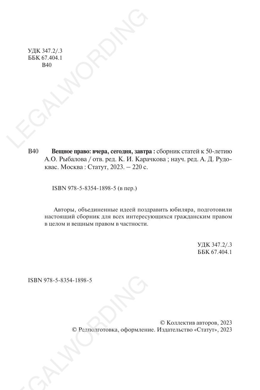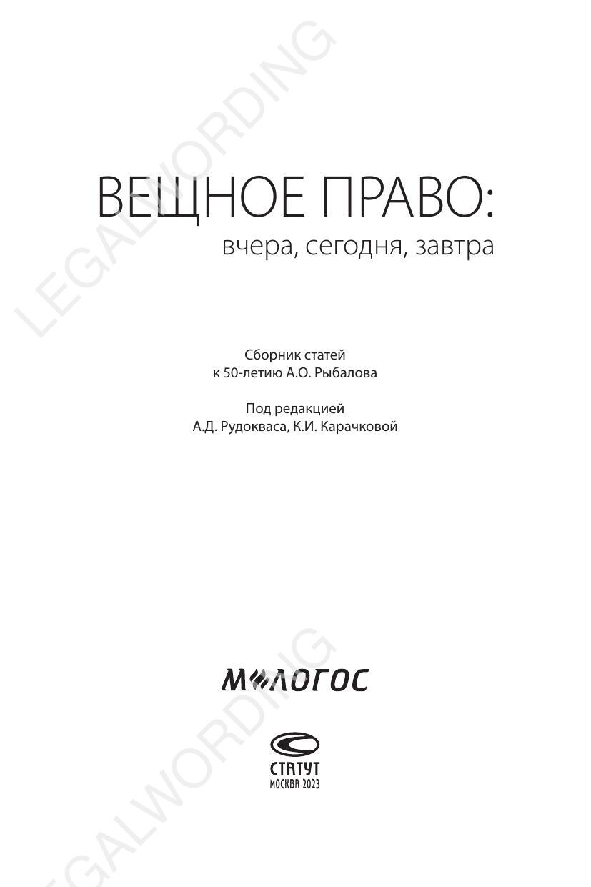Imprint: Proprietary law: yesterday, today, tomorrow : a collection of articles for the 50th anniversary of A.O. Rybalov / ed. by K. I. Karachkova ; scientific ed. by A. D. Rudokvas. Moscow : Statute, 2023. - 220 с.