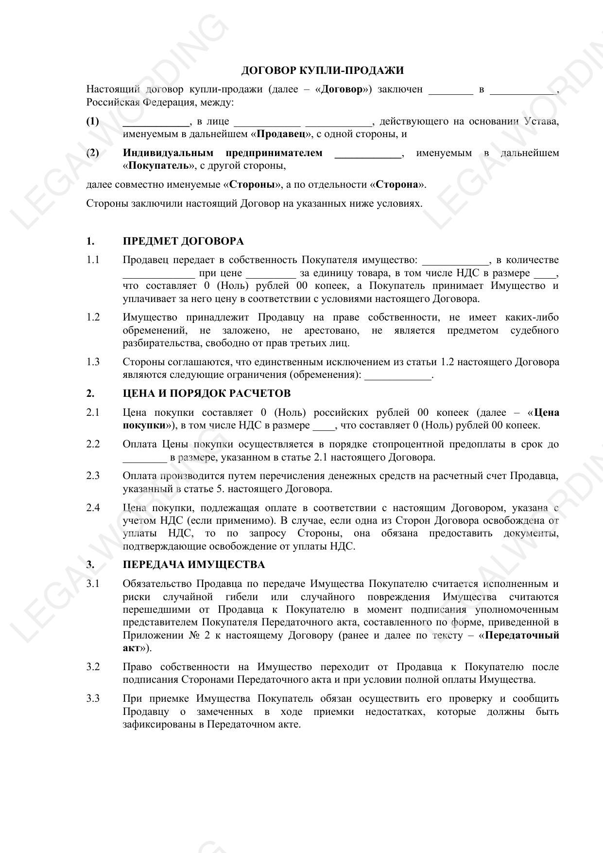 A template for a purchase and sale agreement concluded between legal entities. The contract template is intended for registration of the transfer of property from the Seller to the Buyer with detailed terms of payment and transfer.