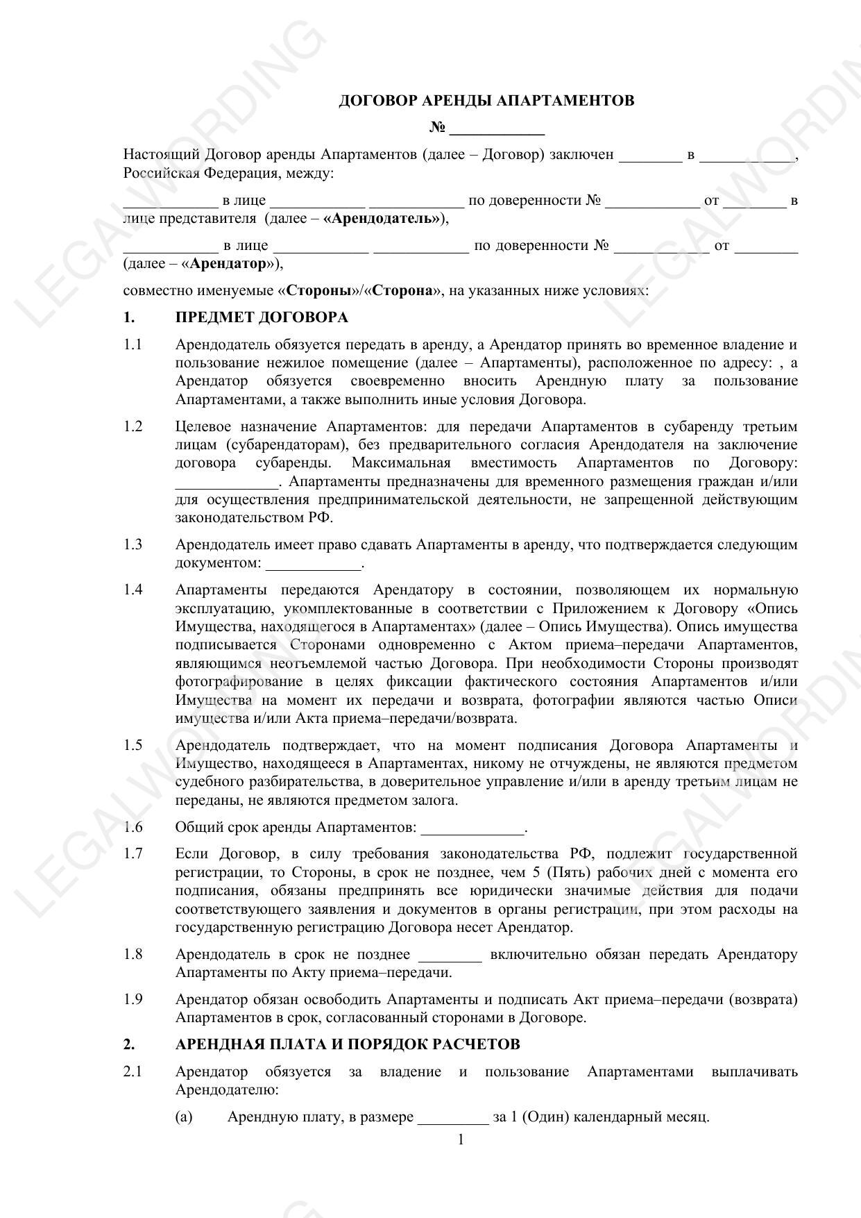 A template for an apartment rental agreement concluded between individuals. The apartment rental agreement regulates the transfer of apartments for temporary possession and use to the Tenant, who undertakes to pay the rent in a timely manner and comply with the remaining terms of the agreement. The document includes the main sections:
