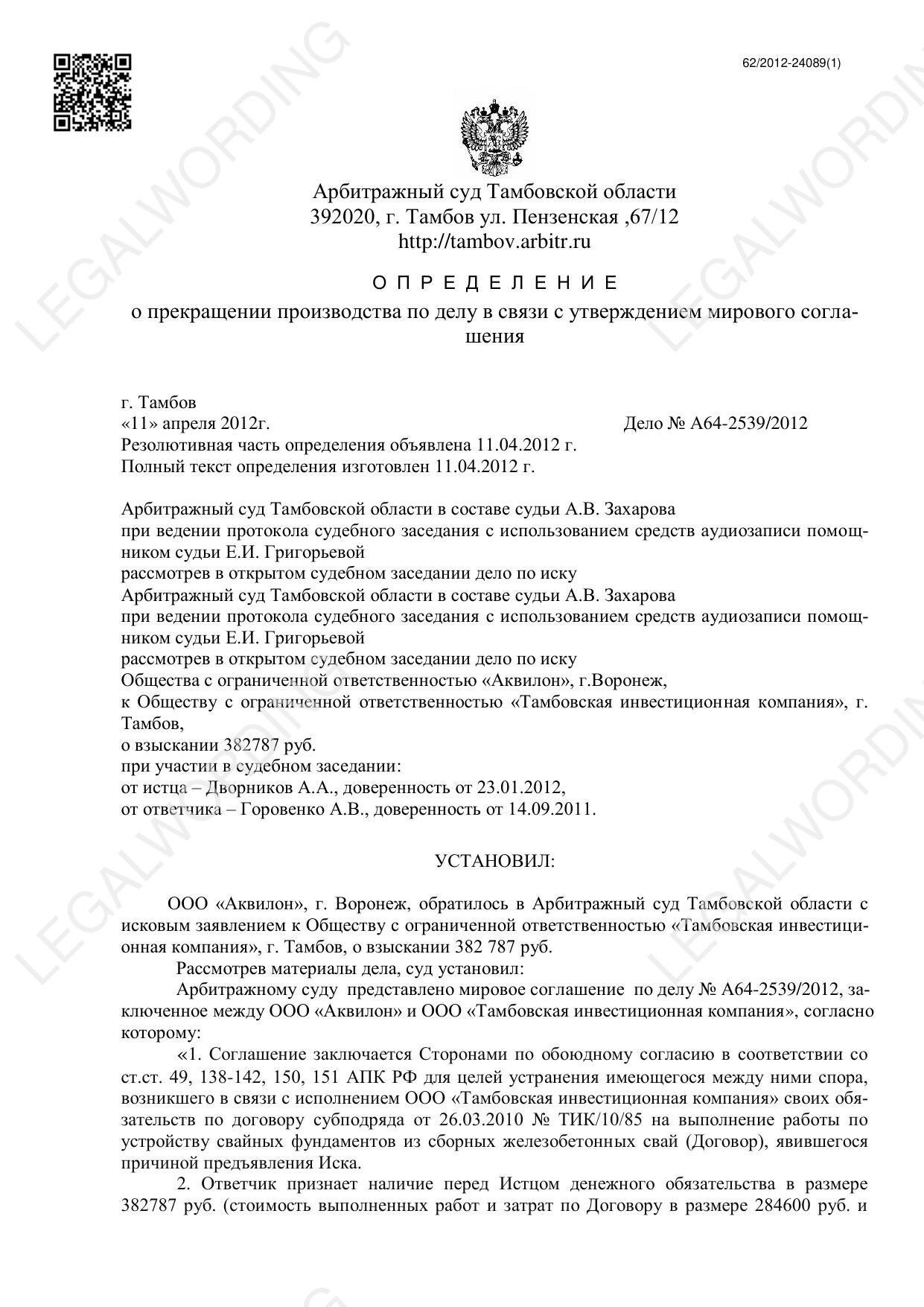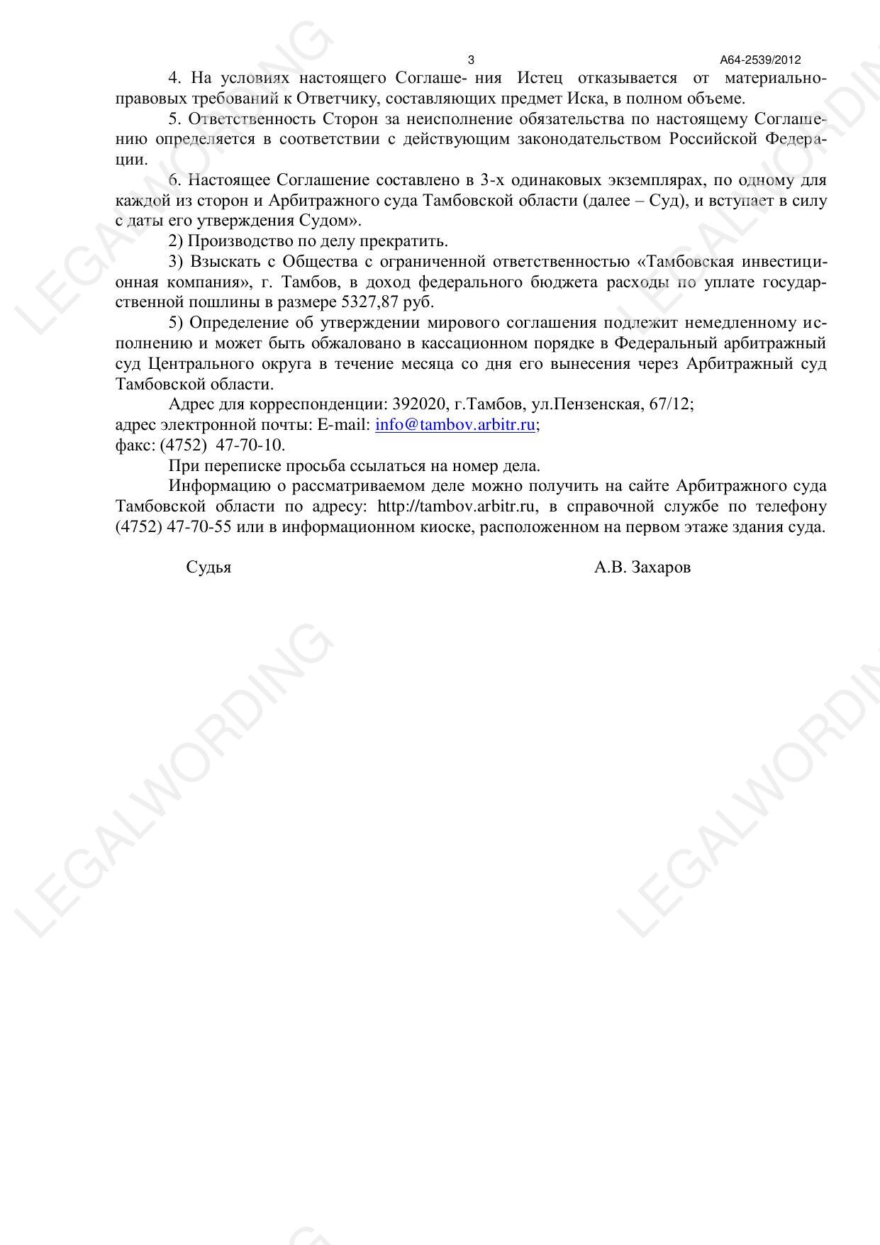 Settlement of the dispute by concluding a settlement agreement in the case A64-2539/2012 in the Arbitration Court of the Tambov region.Similar case no. A64-794/2010