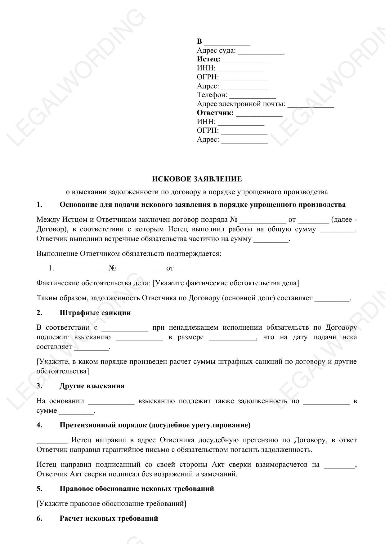 The template of the statement of claim for debt collection under the contract in the simplified procedure. This document is intended for filing in court between a legal entity (Plaintiff) and an individual entrepreneur (Defendant). The template includes the following key sections: