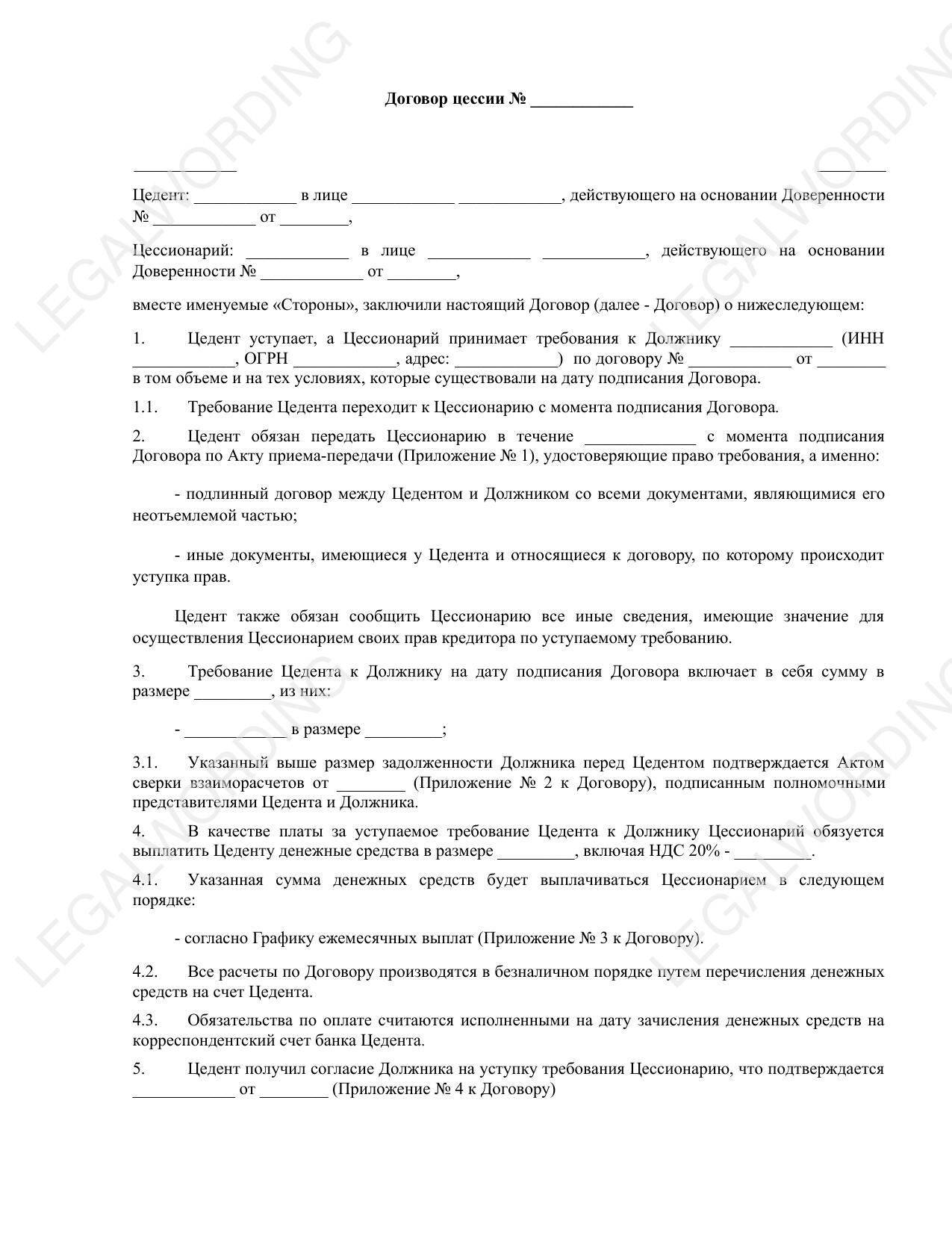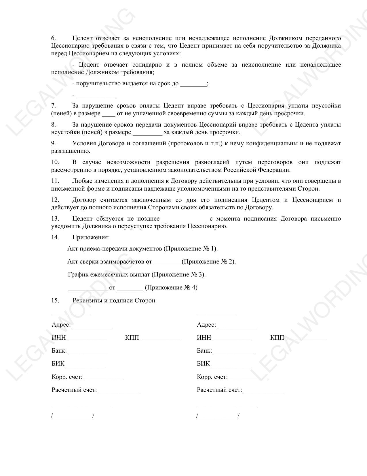 A template for an assignment agreement used to assign a claim from one legal entity to another. This document contains the following key sections: 1. Assignment of a claim - The Assignor concedes, and the Assignee accepts claims against the debtor under a certain contract. 2. Transfer of claim - The Assignor's claim to the debtor passes to the Assignee from the moment of signing the contract. 3. Delivery and acceptance of documents - the procedure for the transfer of documents certifying the right of claim, and the deadline for their transfer. 4. Assignment fee - the terms of payment of funds to the Assignor for the assigned claim. 5. Surety - the Assignor's responsibility for the fulfillment of the debtor's claims and the terms of the surety. 6. Liability - penalties for violation of payment deadlines and transfer of documents. 7. Confidentiality - information about the agreement is confidential and not subject to disclosure. 8. Dispute resolution - the procedure for resolving disputes between the parties. The agreement regulates important aspects of the assignment of claims, including the terms of transfer, payment, liability and interaction of the parties
