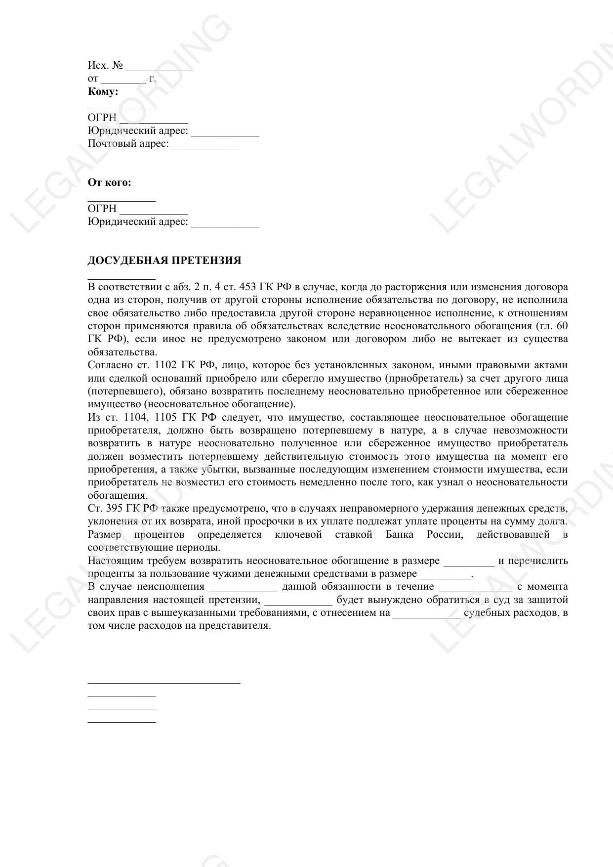 The template of a pre-trial claim for unjustified enrichment will help to send a claim to the debtor demanding the return of unreasonably acquired property or its value.