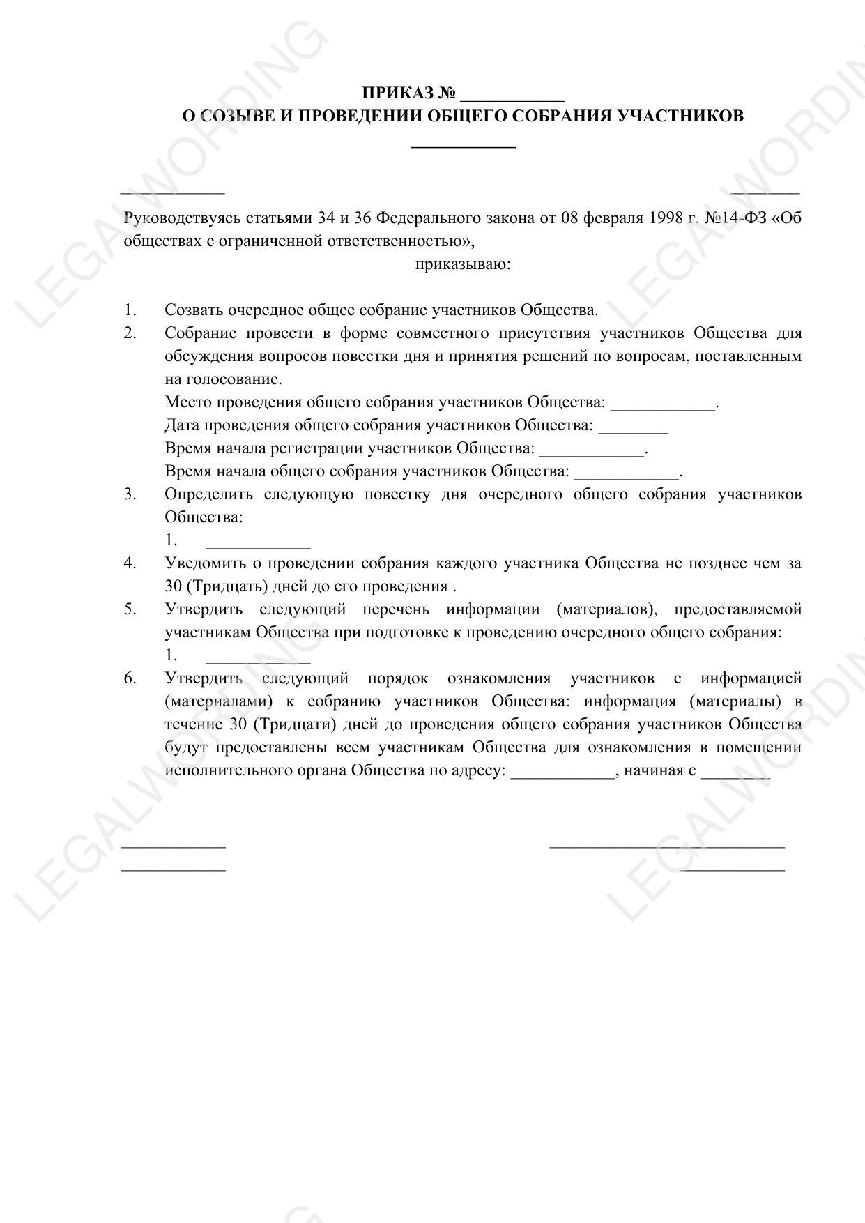 The template for the order to convene and hold a general meeting of participants is intended for use in limited liability companies (LLC). It regulates the procedure for announcing and holding a general meeting of the company's participants and includes the main sections: Convocation of the meeting - a description of the procedure and an indication of the date of the general meeting. The form of the meeting is a meeting with the joint presence of participants. Place and time - details about the venue and the start time of registration of participants and the meeting itself. The agenda is the key issues to be discussed and voted on. Notification of participants - rules and deadlines for notifying each participant about the upcoming meeting. Information materials - a list and procedure for familiarizing participants with the necessary materials for preparing for the meeting. The document describes in detail the organization and conduct of the general meeting of participants, including all necessary legal and organizational aspects