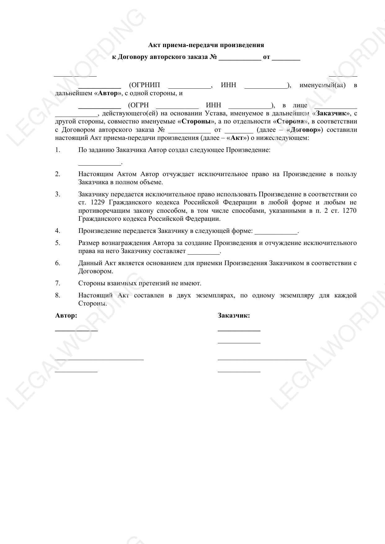 Акт приема-передачи произведения предназначен для оформления передачи произведения Автором Заказчику в рамках Договора авторского заказа. Документ включает ключевые элементы:
