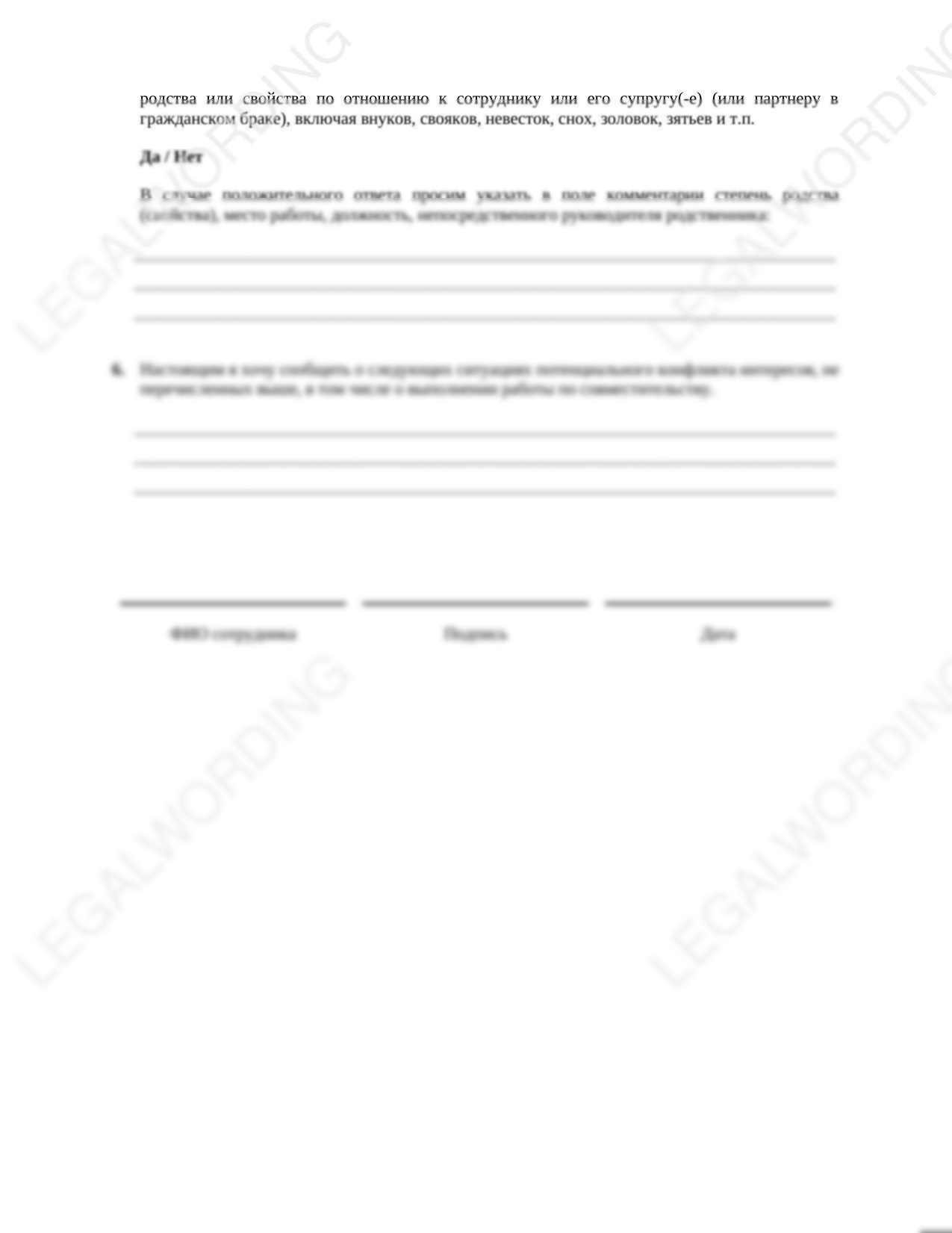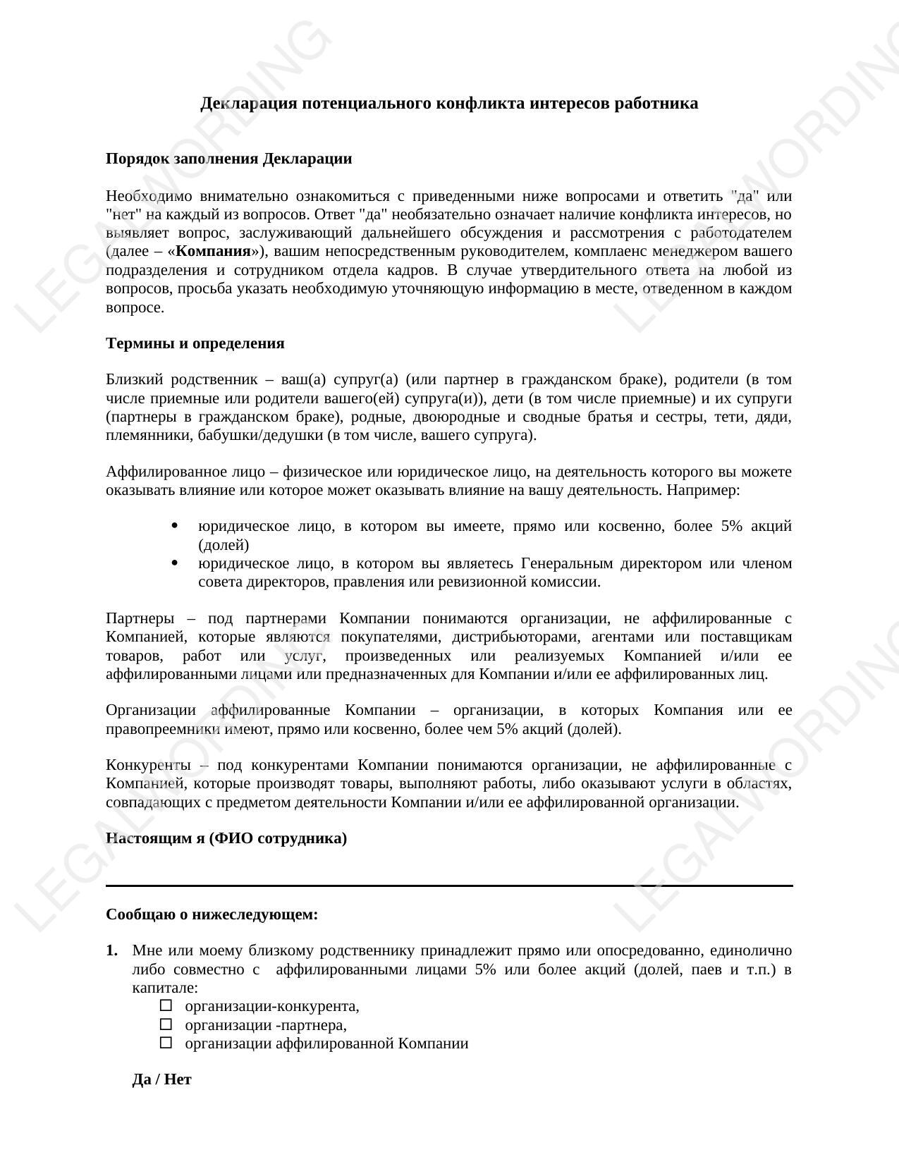 Декларация потенциального конфликта интересов работника представляет собой официальный документ, в котором сотрудник компании указывает возможные обстоятельства или ситуации, которые могут привести к конфликту интересов между его личными, финансовыми или профессиональными интересами и интересами работодателя.