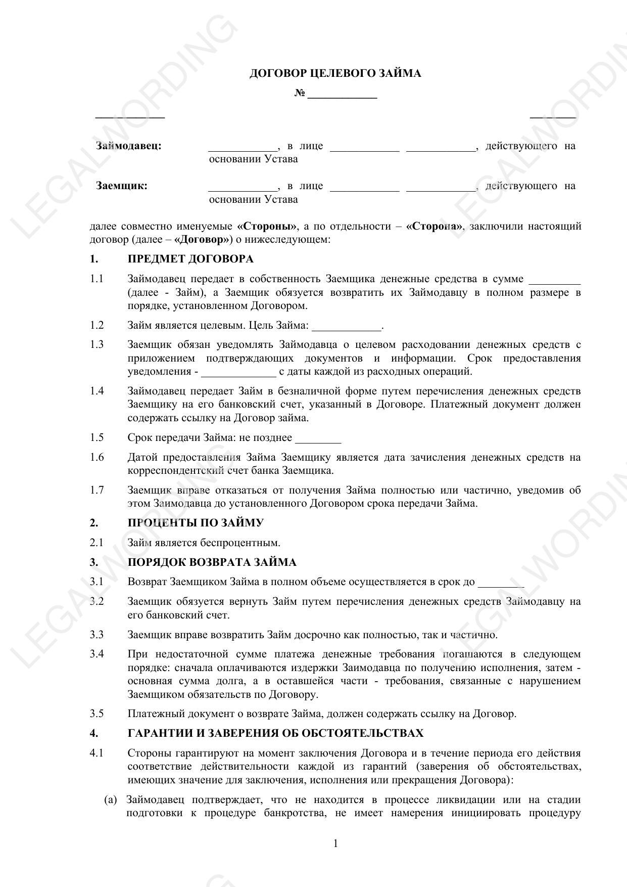 Шаблон договора целевого займа, предназначенный для использования между физическим лицом и юридическим лицом. Данный договор регулирует отношения по предоставлению целевого займа физическим лицом (Займодавцем) юридическому лицу (Заемщику) с обязательством возврата средств в установленный срок и на определённых условиях.