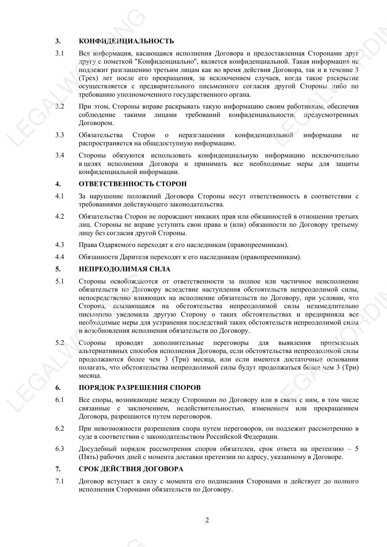 Шаблон договора дарения оборудования, заключаемого между физическими и юридическими лицами. Данный шаблон предназначен для оформления безвозмездной передачи оборудования от дарителя к одаряемому. Документ охватывает ключевые аспекты: Предмет договора - обязательства дарителя передать оборудование в собственность одаряемого безвозмездно. Порядок передачи оборудования - условия и сроки передачи оборудования по акту приема-передачи. Конфиденциальность - защита информации, связанной с исполнением договора. Ответственность сторон - условия ответственности за невыполнение обязательств по договору. Непреодолимая сила - освобождение от ответственности в случае форс-мажорных обстоятельств. Порядок разрешения споров - процедура досудебного разрешения конфликтов и условия обращения в суд. Срок действия договора - время действия договора и условия его расторжения. Договор регулирует порядок передачи оборудования, соблюдение конфиденциальности, ответственность сторон и разрешение возможных споров. Он также включает приложения, такие как акт приема-передачи оборудования и реквизиты сторон