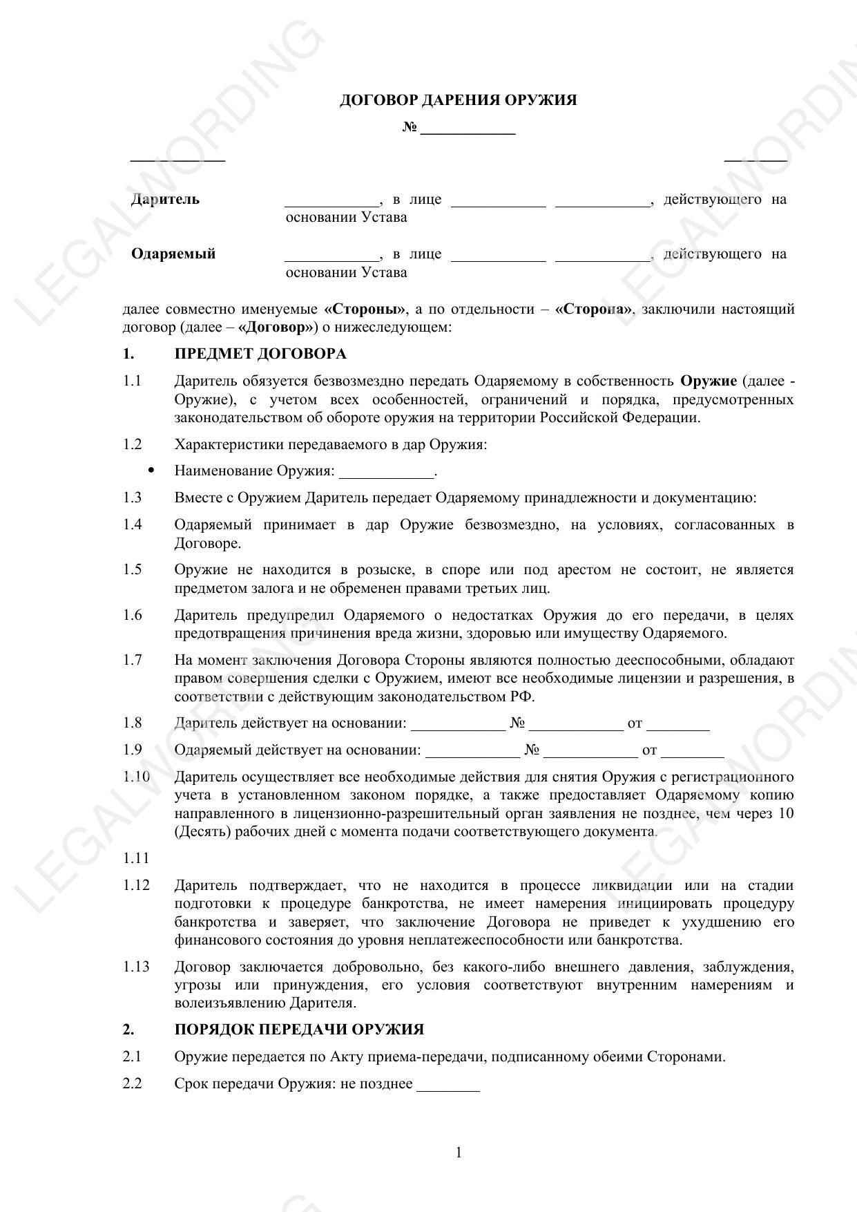 Шаблон договора дарения оружия, предназначенного для оформления передачи оружия между физическими лицами или юридическими лицами. Договор дарения оружия регулирует передачу собственности на оружие от Дарителя к Одаряемому и включает ключевые разделы: Предмет договора - обязательства Дарителя передать оружие в собственность Одаряемому безвозмездно, с учетом законодательства об обороте оружия. Порядок передачи оружия - процедура передачи оружия по акту приема-передачи, сроки и условия передачи. Характеристики оружия - детальное описание передаваемого в дар оружия и сопутствующих принадлежностей и документации. Ответственность сторон - условия возмещения вреда, причиненного из-за недостатков оружия, и ответственность за нарушение договора. Конфиденциальность - обязательства сторон по неразглашению информации, связанной с исполнением договора. Форс-мажор - освобождение от ответственности за неисполнение обязательств в случае наступления непреодолимых обстоятельств. Порядок разрешения споров - условия досудебного урегулирования и судебного рассмотрения споров. Договор содержит положения о правах и обязанностях сторон, порядке регистрации оружия, а также о защите конфиденциальной информации