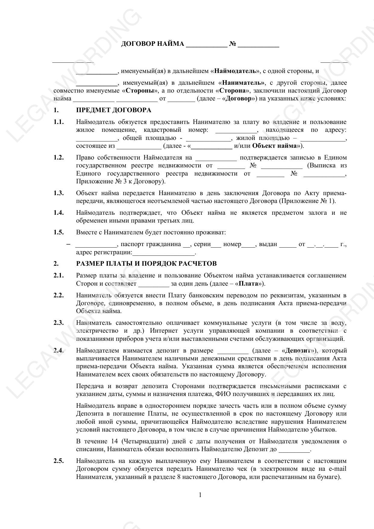 Договор найма жилого помещения (для сдачи жилого помещения физлицам)