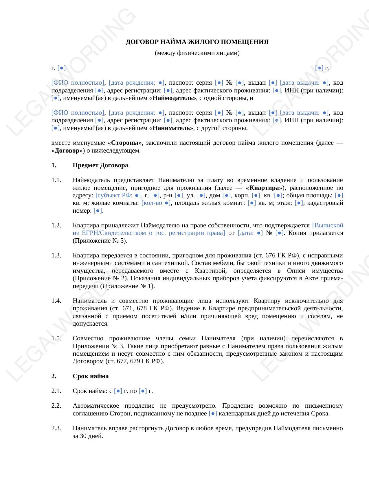 Договор найма жилого помещения между физлицами — регулирует отношения между собственником квартиры (Наймодателем) и нанимателем (Нанимателем).