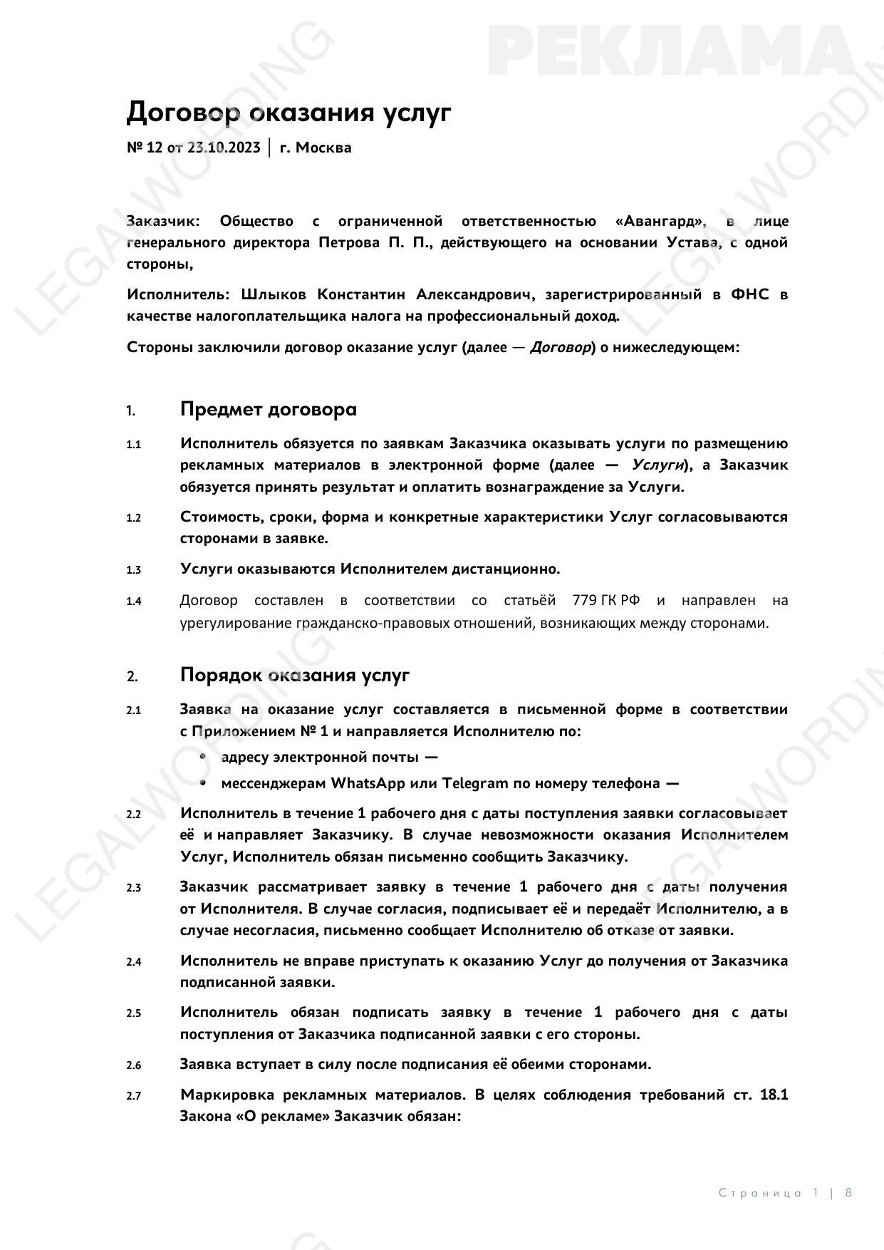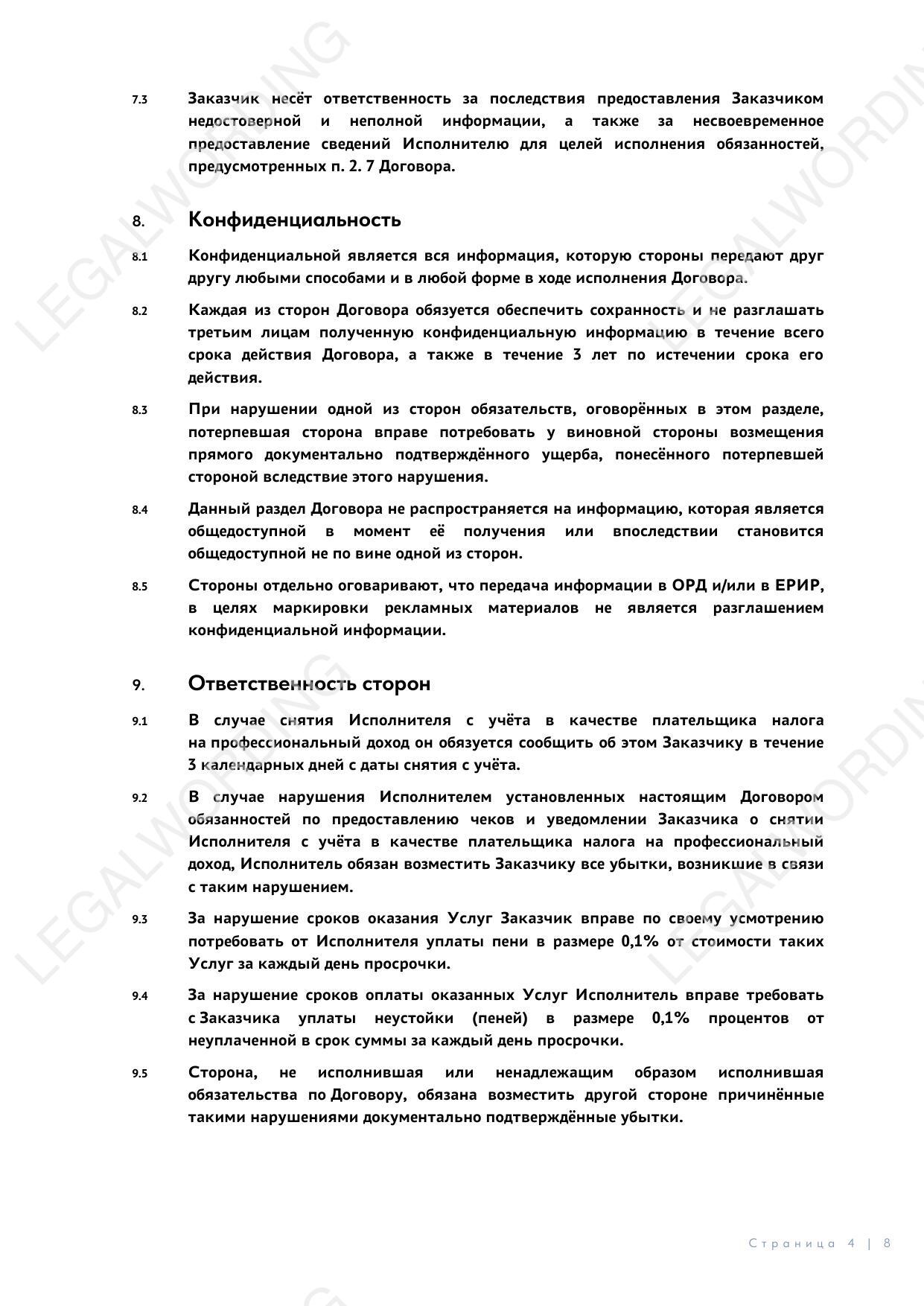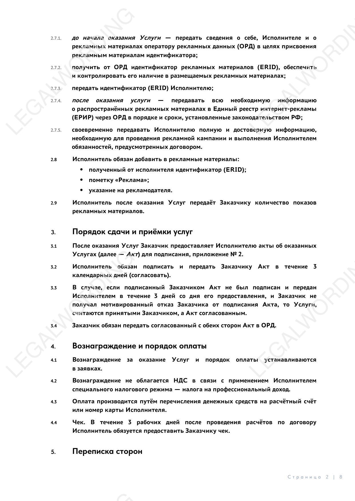 В договоре предусмотрен порядок действия при маркировке рекламы, а также ответственность за нарушение.