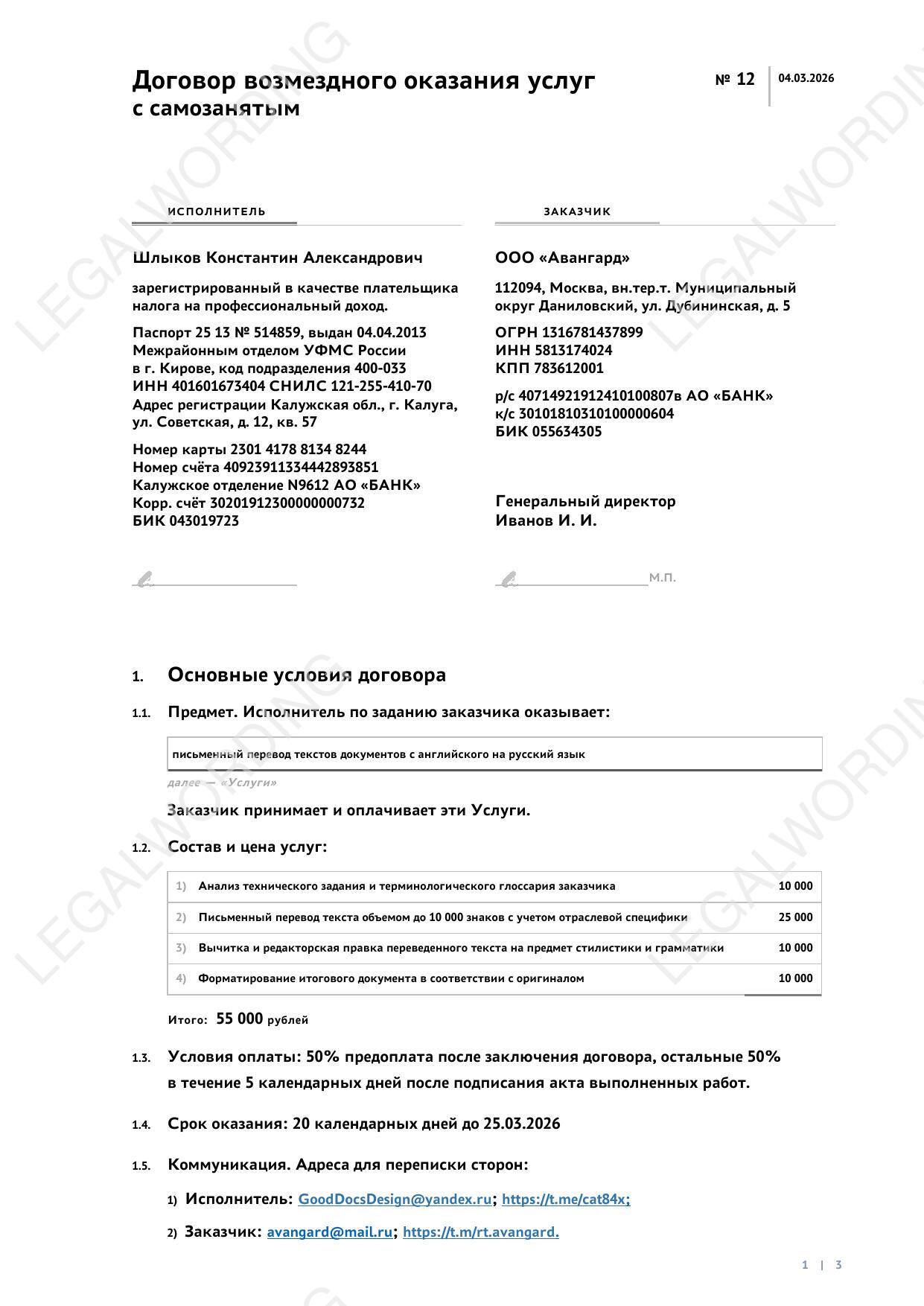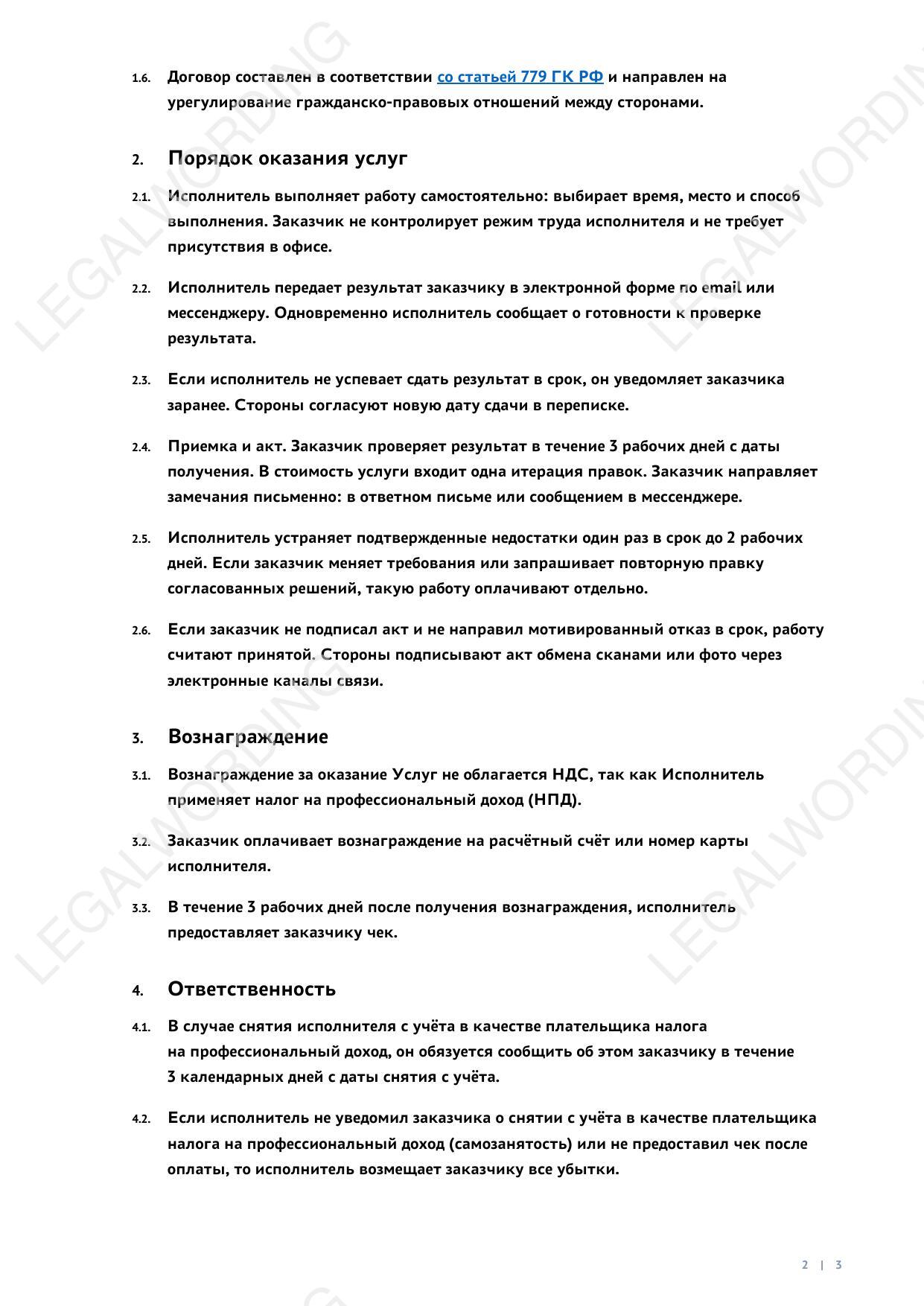 Договор с самозанятым с учетом рекомендаций коллег и правовых систем. Например, есть разбивка услуг на этапы работы с отдельной ценой или охранные заклинания от переквалификации.