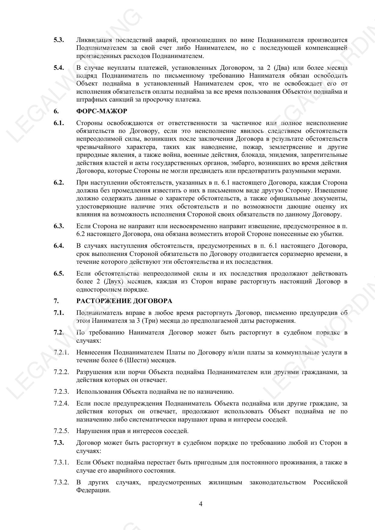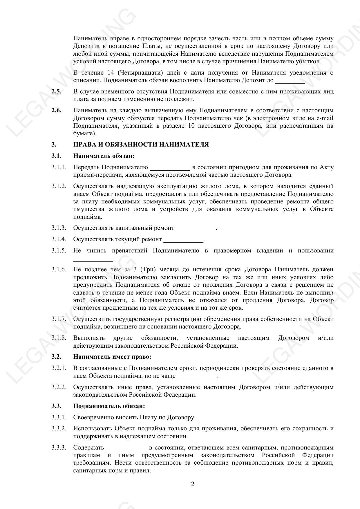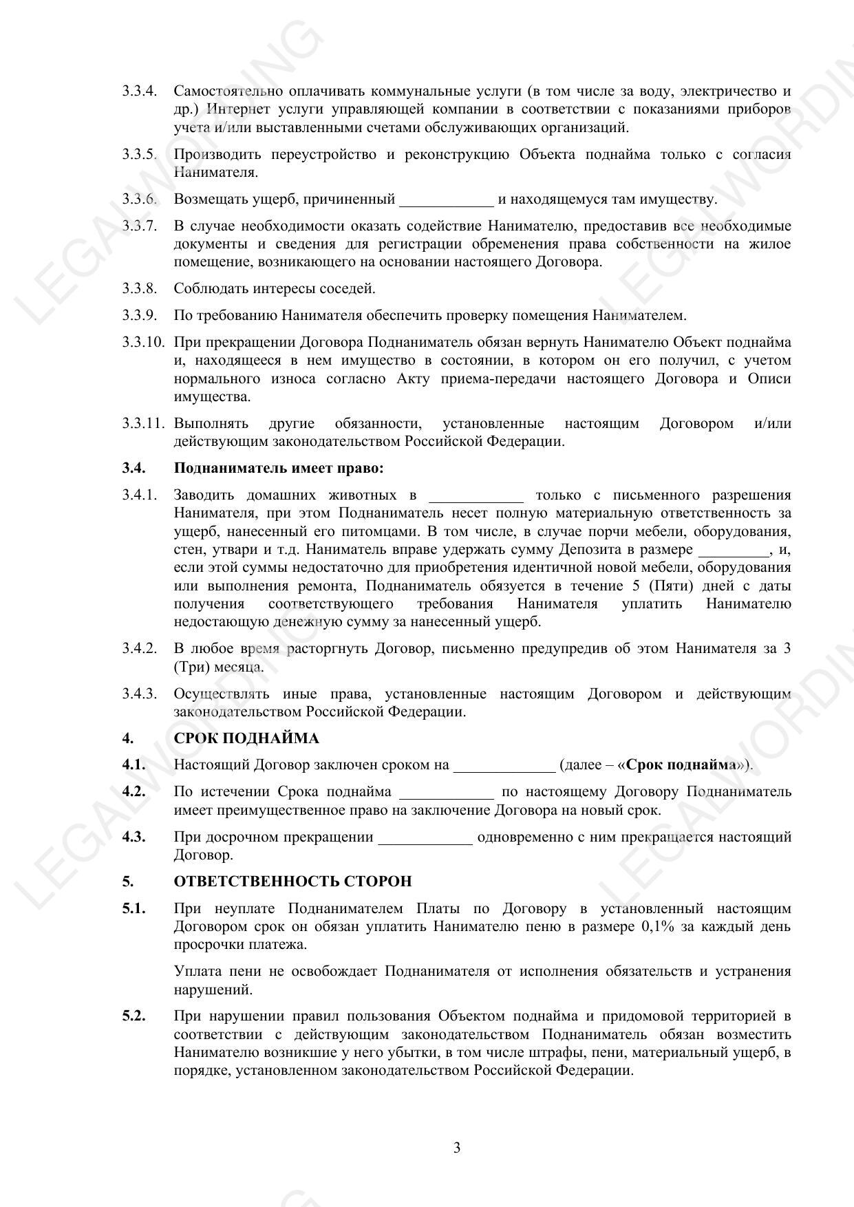Шаблон договора поднайма, заключаемого между физическими лицами, предназначен для передачи права владения и пользования жилым помещением от одного лица (Наниматель) другому (Поднаниматель) на определенный срок и условиях. Документ включает важные разделы: 1. Предмет договора – описывает обязательства Нанимателя по предоставлению жилого помещения и Поднанимателя по оплате его использования. 2. Размер платы и порядок расчетов – условия установления и оплаты платы за поднайм, включая коммунальные платежи и депозит. 3. Права и обязанности сторон – детализирует обязательства и права Нанимателя и Поднанимателя в ходе действия договора. 4. Ответственность сторон – регулирует вопросы неуплаты, порчи имущества и компенсаций. 5. Форс-мажор – освобождение от ответственности при возникновении чрезвычайных обстоятельств. 6. Расторжение договора – условия и порядок досрочного прекращения договора. 7. Заключительные положения – условия разрешения споров, возврата депозита и государственной регистрации. Договор поднайма регулирует многие аспекты взаимодействия между Нанимателем и Поднанимателем, обеспечивая правовые рамки для безопасного и эффективного использования жилого помещения