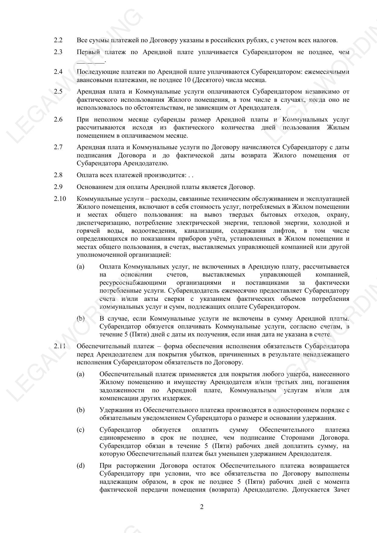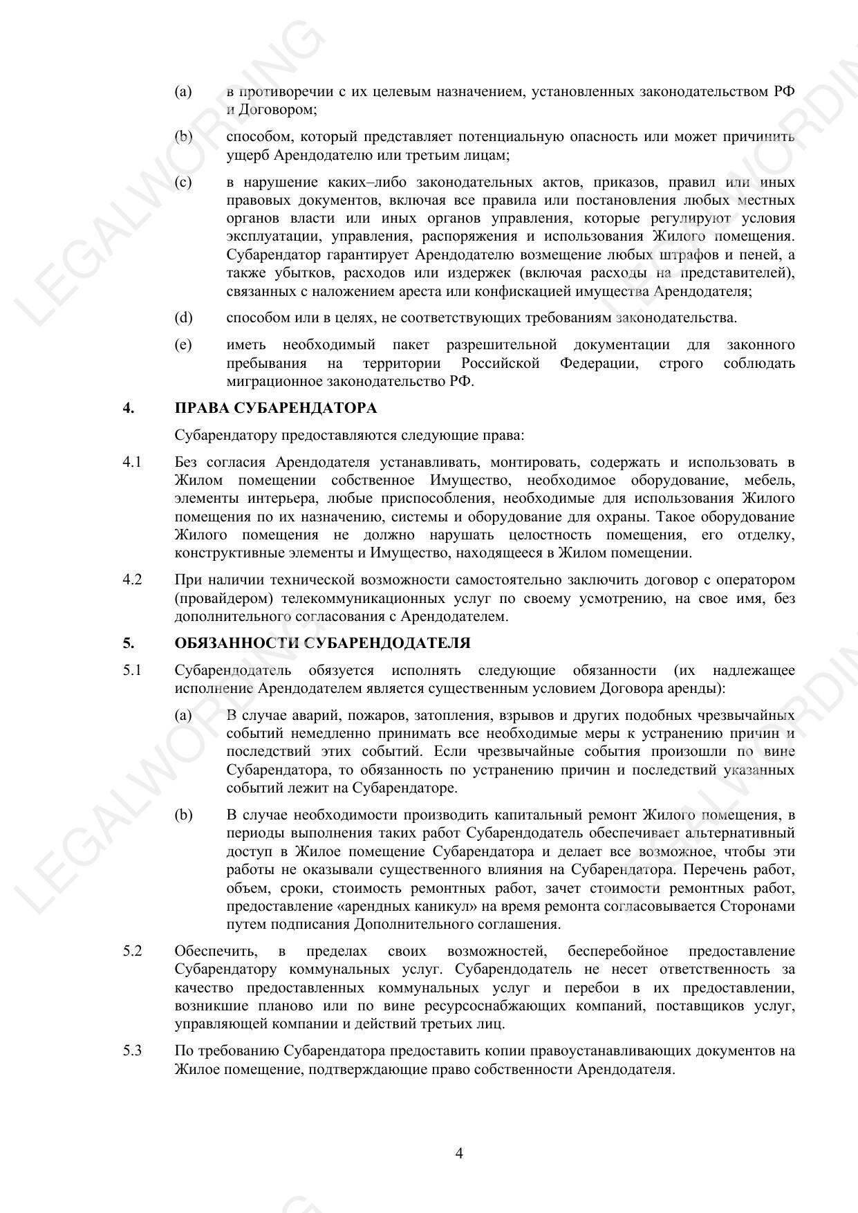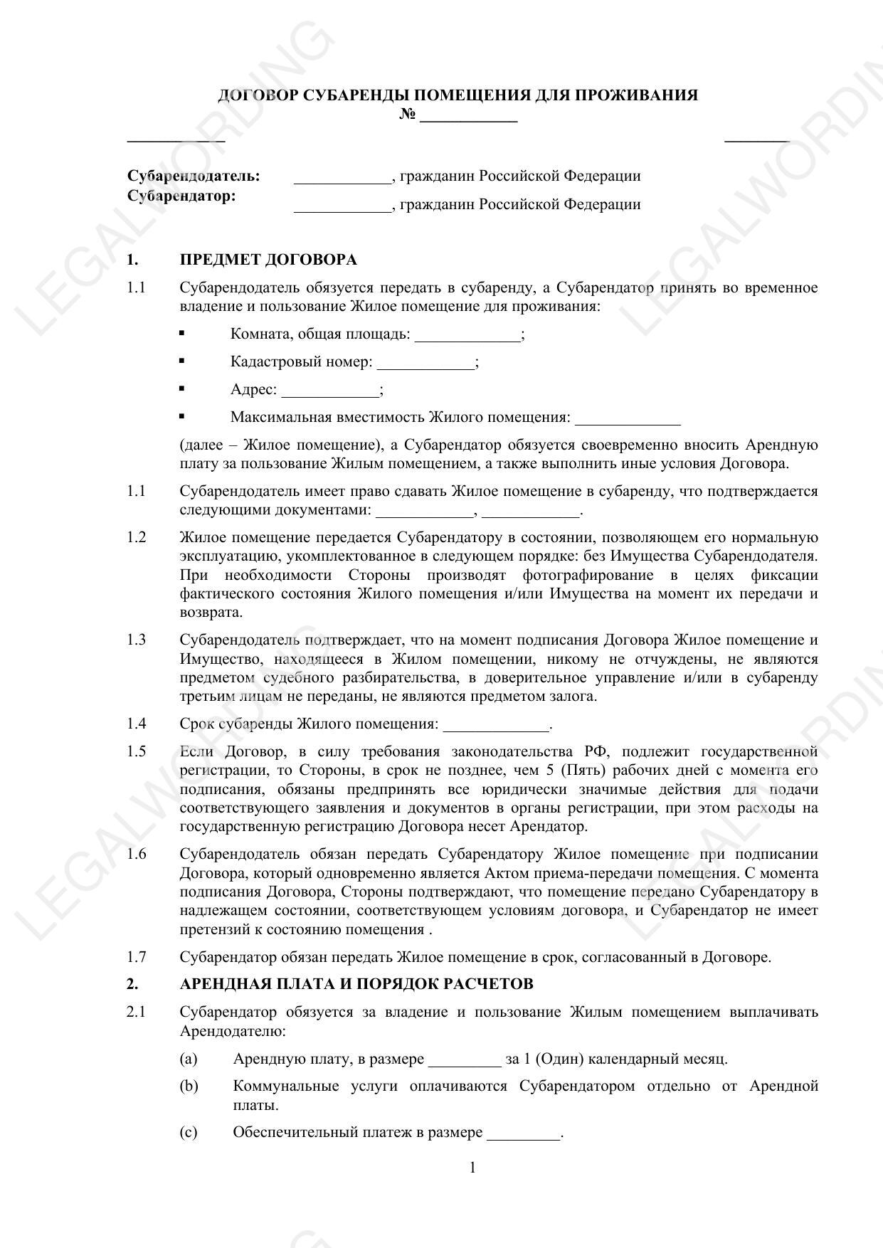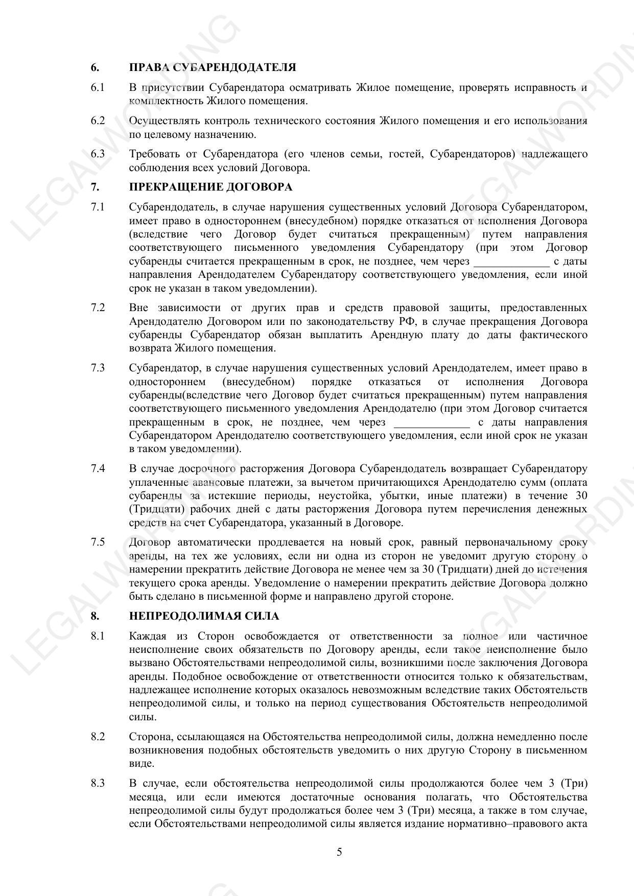 Шаблон договора субаренды помещения для проживания предназначен для использования между гражданами Российской Федерации. Документ содержит следующие основные разделы: Предмет договора — включает обязательства Субарендодателя передать Жилое помещение в субаренду, а Субарендатора принять его во временное владение и пользование, а также оплатить за это арендную плату. Сдача и приемка помещения — порядок передачи и возврата Жилого помещения, включая фиксацию состояния помещения на момент передачи и возврата. Арендная плата и порядок расчетов — устанавливает размеры арендной платы, сроки её внесения, оплату коммунальных услуг и обеспечительный платеж. Права и обязанности сторон — детализирует права и обязанности как Субарендодателя, так и Субарендатора, включая обязательства по техническому обслуживанию и ремонту, порядок использования жилого помещения и взаимодействие между сторонами. Прекращение договора — условия расторжения договора, включая порядок возврата платы и возможные санкции за нарушения условий аренды. Форс-мажор — освобождает от ответственности за неисполнение обязательств в случае возникновения обстоятельств непреодолимой силы. Ответственность сторон — нормы касаемо ответственности за нарушение обязательств, включая штрафные санкции и порядок возмещения ущерба. Заключительные положения — включает срок действия договора, порядок внесения изменений и дополнений, а также другие общие условия. Приложения — обязательные для выполнения правила пользования жилым помещением. Договор субаренды регулирует условия временного пользования жилым помещением, порядок взаимодействия сторон, их права и обязанности, а также ответственность за нарушения и порядок разрешения споров