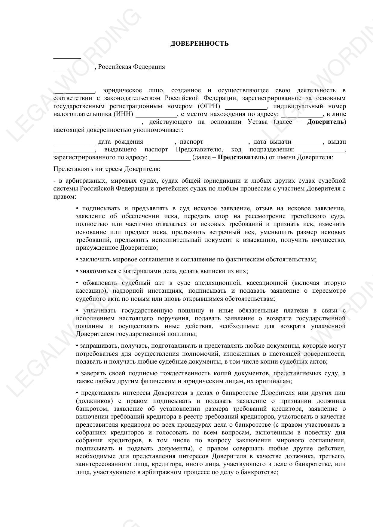 1. Представительство интересов Доверителя в судах всех инстанций, включая арбитражные, мировые, суды общей юрисдикции и третейские суды.